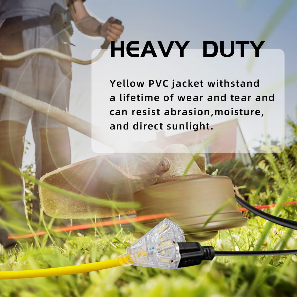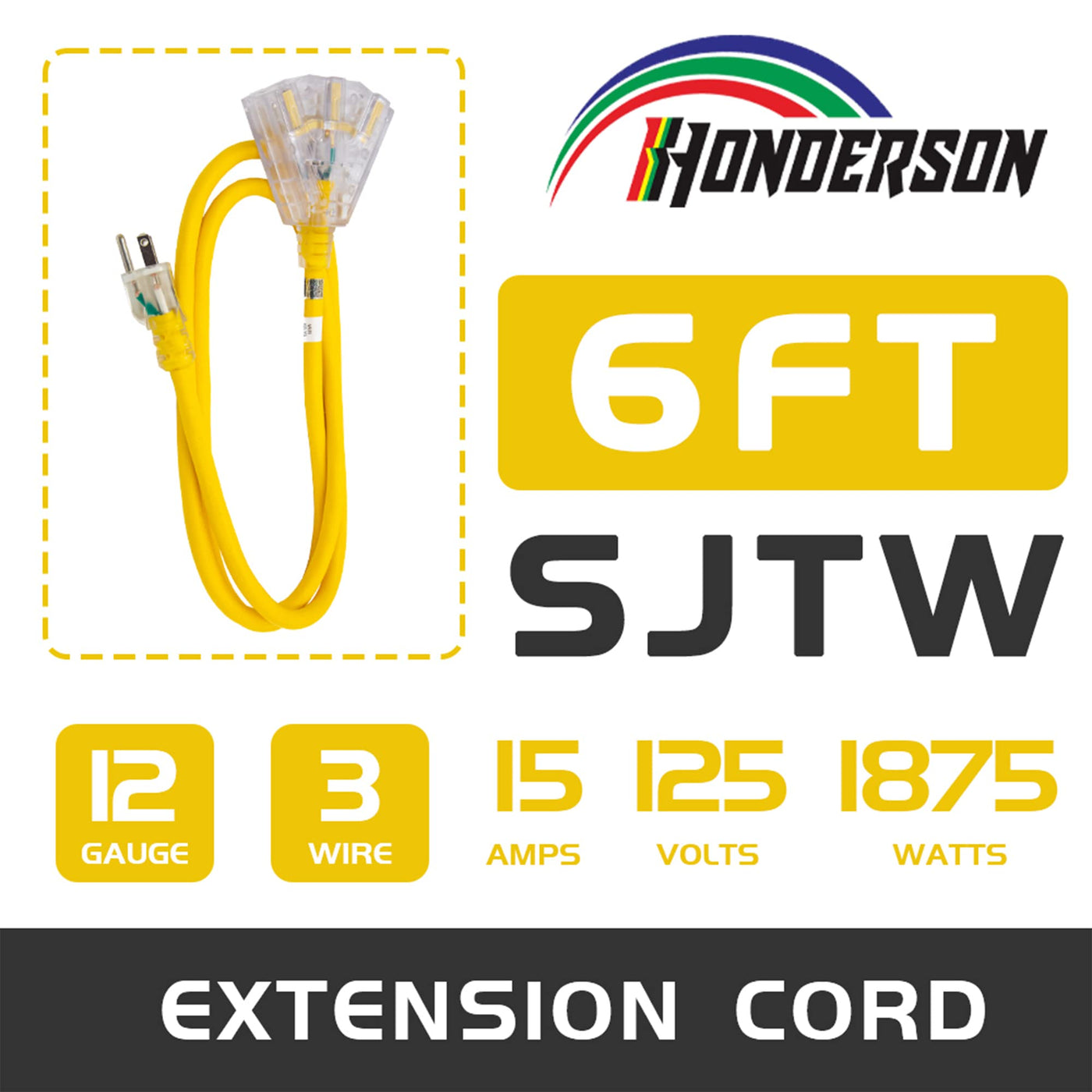 Honderson 6 Ft Lighted Outdoor Extension Cord With 3 Power Outlets,12/3 Sjtw Heavy Duty Yellow Extension Cable With 3 Prong Grou