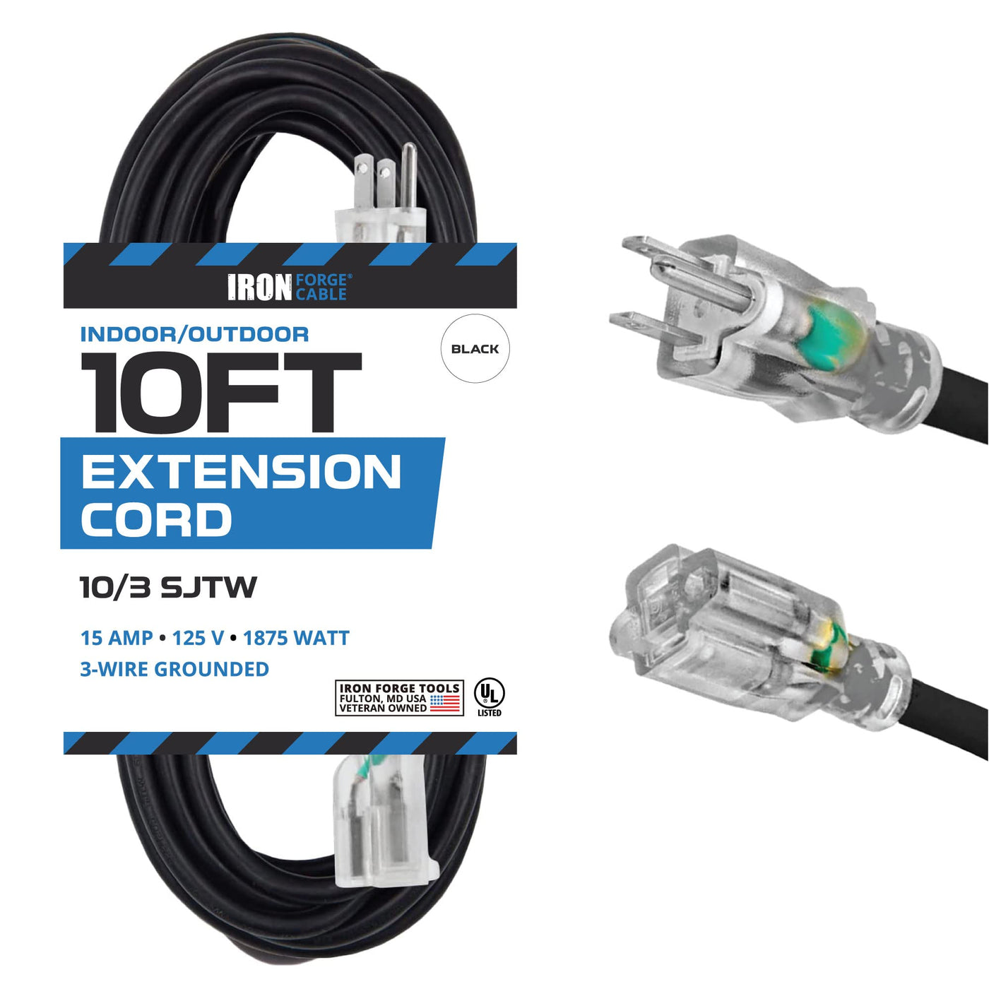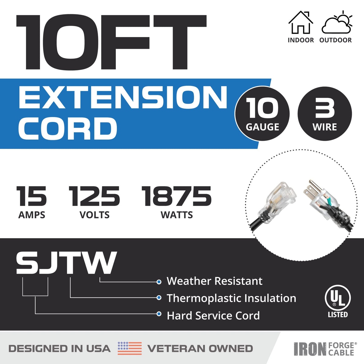 Ultra Heavy Duty Extension Cord - Our 10 Awg Extension Cord Are Made Heavy Duty For Outdoor And Indoor Use. Great For Construction Site, Home Use To Power Major Appliance, Drills, Hammer Drills, Circular Saws, Wet And Dry Vacs, Lawn Mowers, Compressors, Music Equipment, Landscaping, Gardens, Power Tools, Outdoor Lights, Ev Charger, Welding, And Much More.Weatherproof & Flame Retardant: Our High Flexibility Vinyl Covering Is More Resistant To Bending And Won'T Break When Moved, Bent, Or Pulled For An Extended Period Of Time. Our Superior Grade Extension Cable Can Be Used In Extreme Weather Thanks To Our High Quality Covering Material That Protects Cords Against Moisture, Water, Snow, Abrasion, And Sunlight Even After Long Hours Of Use. Easy To Unfold For Extra Convenience And Flexible In Cold Weather.Reinforced Blades: The Nickel-Coated Protects Prongs Of This 10 Awg Heavy Duty Extension Cable 10' From Bending Or Breaking, And Help Secure The Plug Firmly In Place. This Ensures That The Cord Functions Well, Stays In Place, And Remains In Good Condition, And Helps This Cord Last You For Years.Ul Certified, 10 Gauge 3-Wire Grounded, 10 Foot, 15 Amp, 125 Volt, 1875 Watt, Ul Certified. Temperature Range: -40F To +140F100% Satisfaction Guaranteed: Us Veteran Owned - Iron Forge Cable, A U.S. Veteran-Owned Business, Stands Behind Its Extension Cords. If Any Issues Arise, A Replacement Will Be Given.