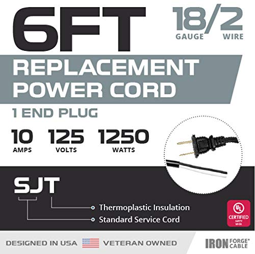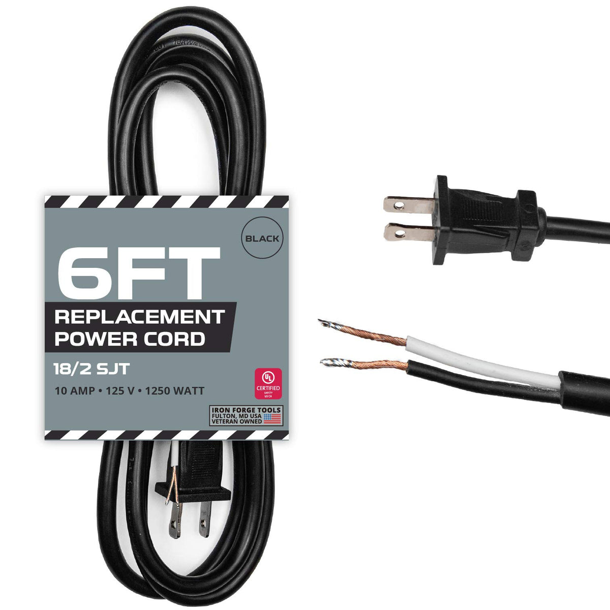 Iron Forge Cable 18 Awg Replacement Power Cord With Open End 6 Ft Black Extension Cable 2 Prong, 2 Wire 18/2 Sjt