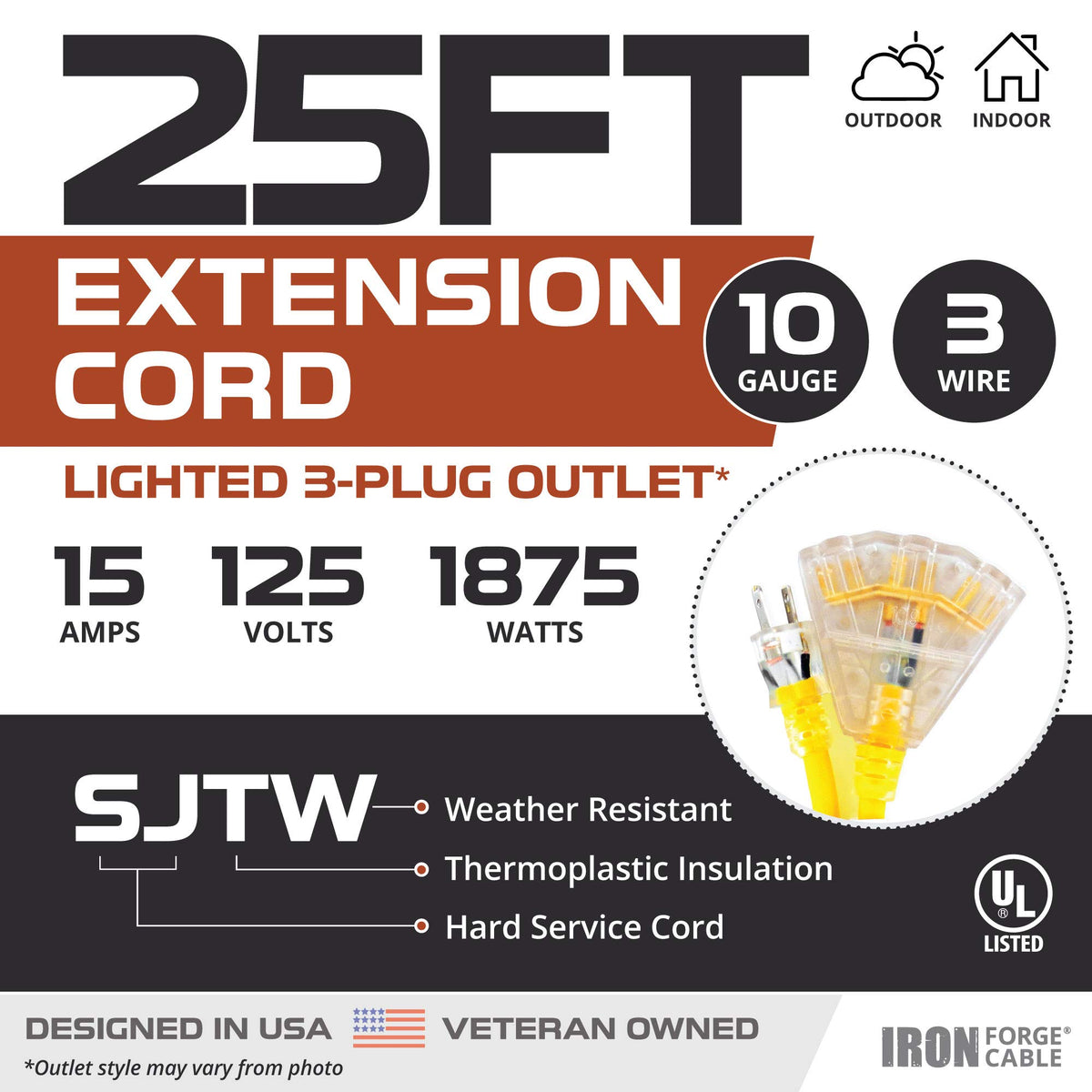 Ultra Heavy Duty Extension Cord: Our 10 Awg Extension Cable 25 Foot Made With Pure Copper Wire Is A Multipurpose Electric Cord, Perfect For Both Indoor And Outdoor And In Any Temperature. Great For Powering Major Household Appliances, Power Tools, Welder, Air Conditioner, Saw, Grinder, Compressor, Generator, Hvac, Lawnmower, As Well As For Landscaping, Gardens, And Outdoor Holiday Lights Decoration. 3 Outlet In 1: This 10 Awg Extension Cord Comes With 3 Outlets In Pigtail Style And Is Built To Last. Sjtw Rated For Water & Corrosion Resistant And Remains Tangled-Free In Any Weather. More Visibility, Safer Work Site: This Appliance Extension Cord Multiple Outlets Comes With Lighted End Letting You Know When The Power Is On, And Highly Visible (Osha Compliant) With Bright Yellow Color. Slip Resistant Design Ensures Continuous Power. Reinforced Blades Protect Prongs From Bending Or Breaking During Heavy Usage. Slip Resistant Design Ensures Continuous Power. Ul Certified: 10 Gauge/10 Awg, 3-Wire Grounded Plug, Ultra Heavy Duty Yellow Electric Cable 3 Outlets Pigtail, 25 Foot, 15 Amp Extension Cord, 125 Volt, 1875 Watt, 5-15P/R.Lifetime Replacement Warranty - Iron Forge Cable Stands Behind All Of Its Extension Cords 100%. If Anything Ever Goes Wrong With This, We Will Replace It With A New Item.