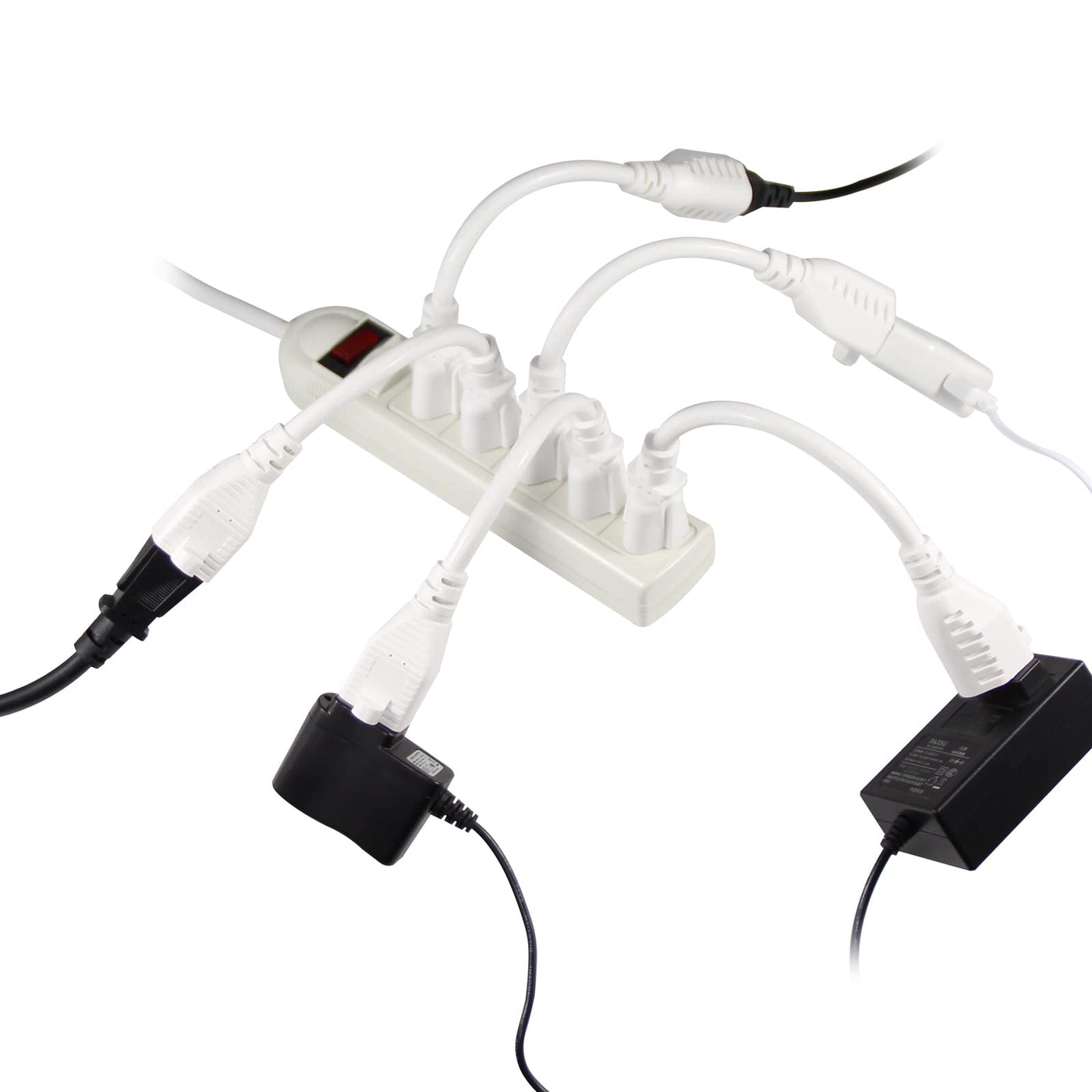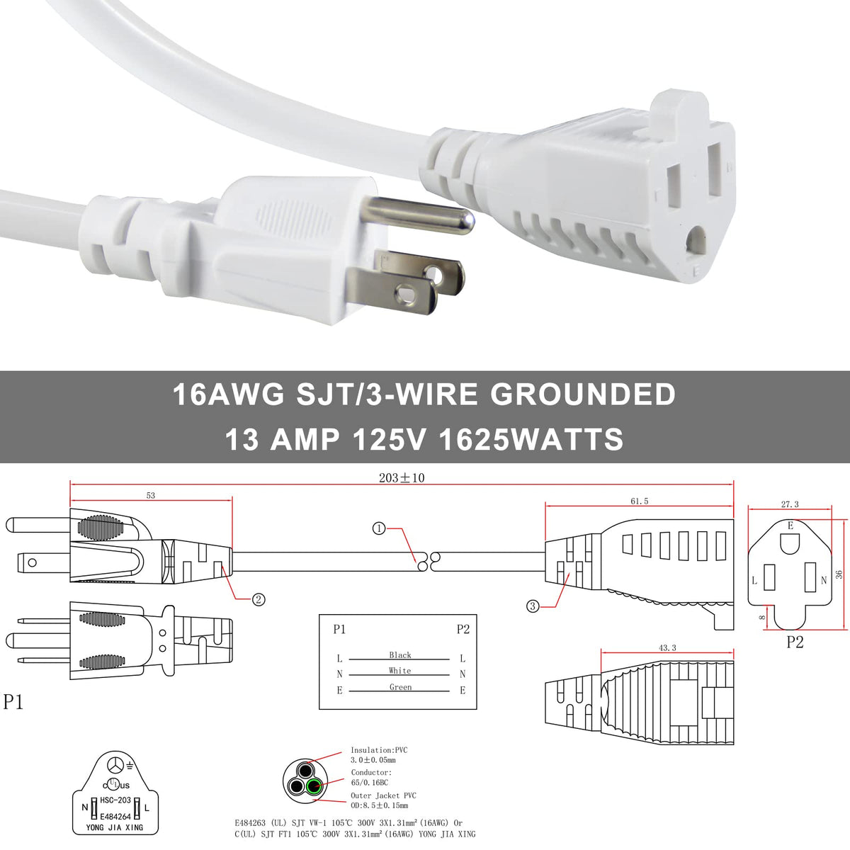 3 Pin Power Extension Cable. Specifications: Input Voltage: 125Vac, 60Hz; Max Power Rating: 13A, Max 1625W; Length: 8 Inch; Color: Black/White; Cable: Sjt 16/3 Gauge; Plug And Outlet: 3Prong Grounded; Save Space:No More Large Plugs Blocking Your Use. Arrange Your Wires Neatly. Easy Storage, Optimizing Space And Making Every Part Of The Home More Beautiful.
