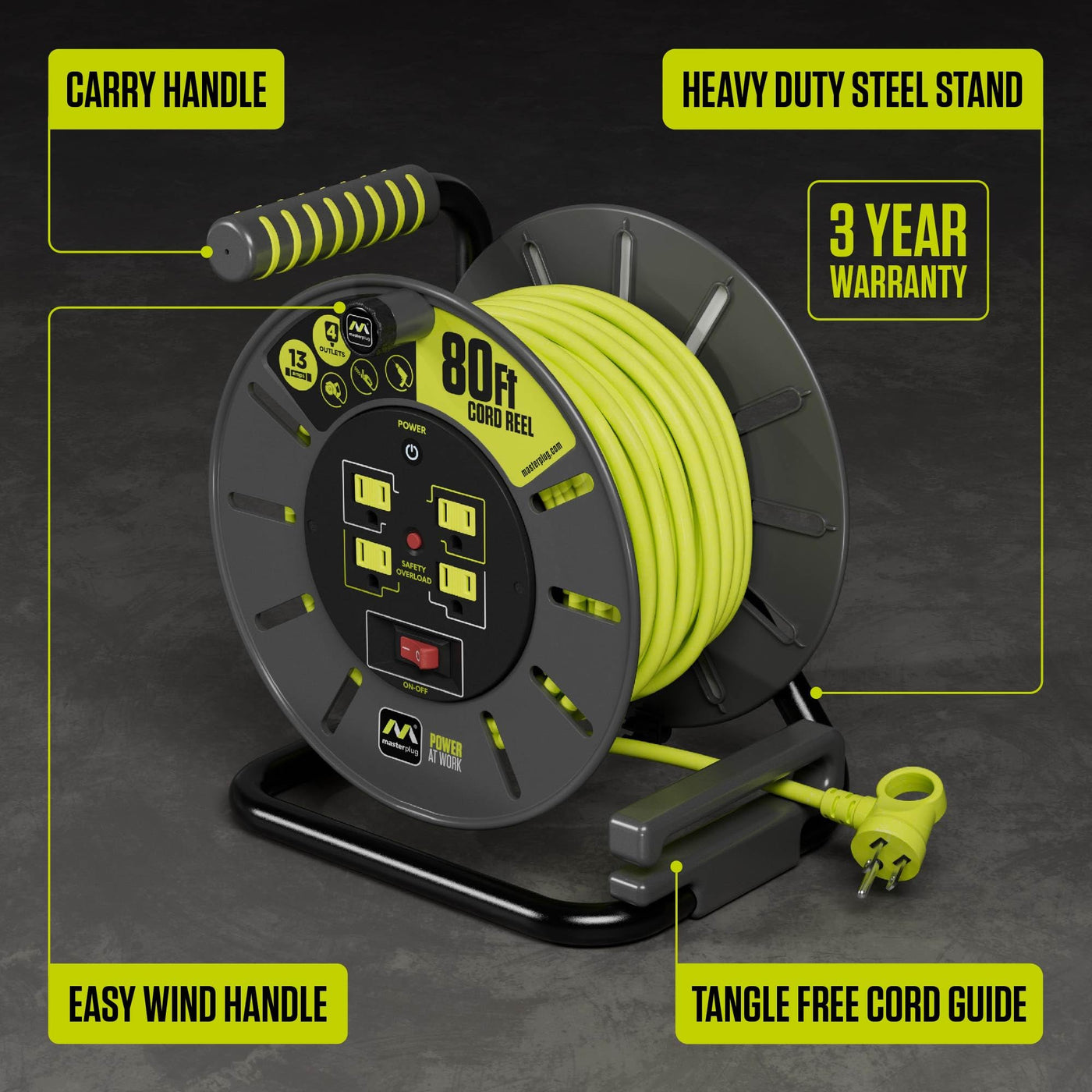 Master Plug'S Easy-Use Open Reel Is Perfect For Use In Workshops, Homes, Yards, And Light Industrial Applications. The Integrated Cord Is Kept Neat And Ready-To-Go And 4 Surge Protected Outlets Ensure You Have Power Where You Need It. The Rugged Open Reel Design Allows For Easy Storage Using The Master Plug Wall Mount Bracket (Sold Separately). Master Plug'S Reels Are Backed By Our Three Year Warranty And Our Customer Support Team, Located In Houston, Texas, Is Ready To Help You, Monday Through Friday.