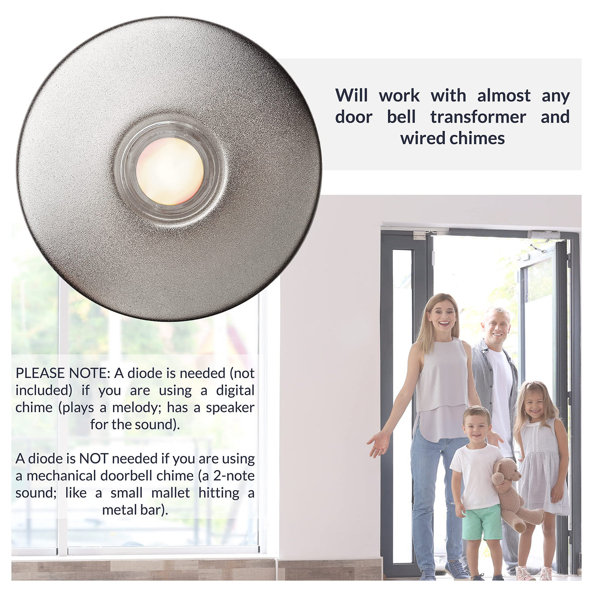 This Lighted Circle Door Bell Chime Button, Measuring 2 12 Inches And Made From Sturdy Satin Nickel White Metal, Can Be Used With Doorbell Chimes, Ringers, And Door Buzzers Its Also Ideal To Use As A Doorbell Button Replacement And May Be Placed On Various Wall Surfaces, Such As Stucco Or Wood If Using As A Replacement, There May Be No Need For Drilling Versatile And Reliable, It Will Work With Practically Any Door Bell Transformer Or Wired Chime With This, You Can Easily Locate The Switch Even After Dark The Doorbell Wire Does Not Come Included In This Package Please Note: A Diode Is Needed (Not Included) If You Are Using A Digital Chime (Plays A Melody Has A Speaker For The Sound) A Diode Is Not Needed If You Are Using A Mechanical Doorbell Chime (A 2-Note Sound Like A Small Mallet Hitting A Metal Bar) Here At Newhouse Hardware, We Are Focused On Providing Our Customers With Durable, Stylish, And Efficient Hardware Products We Provide Fixtures Of The Highest Quality That You Can Depend On For Several Years To Come By Reducing Costs On Replacements Or Repairs, These Products Easily Save You Tons On Money, Time, And Effort