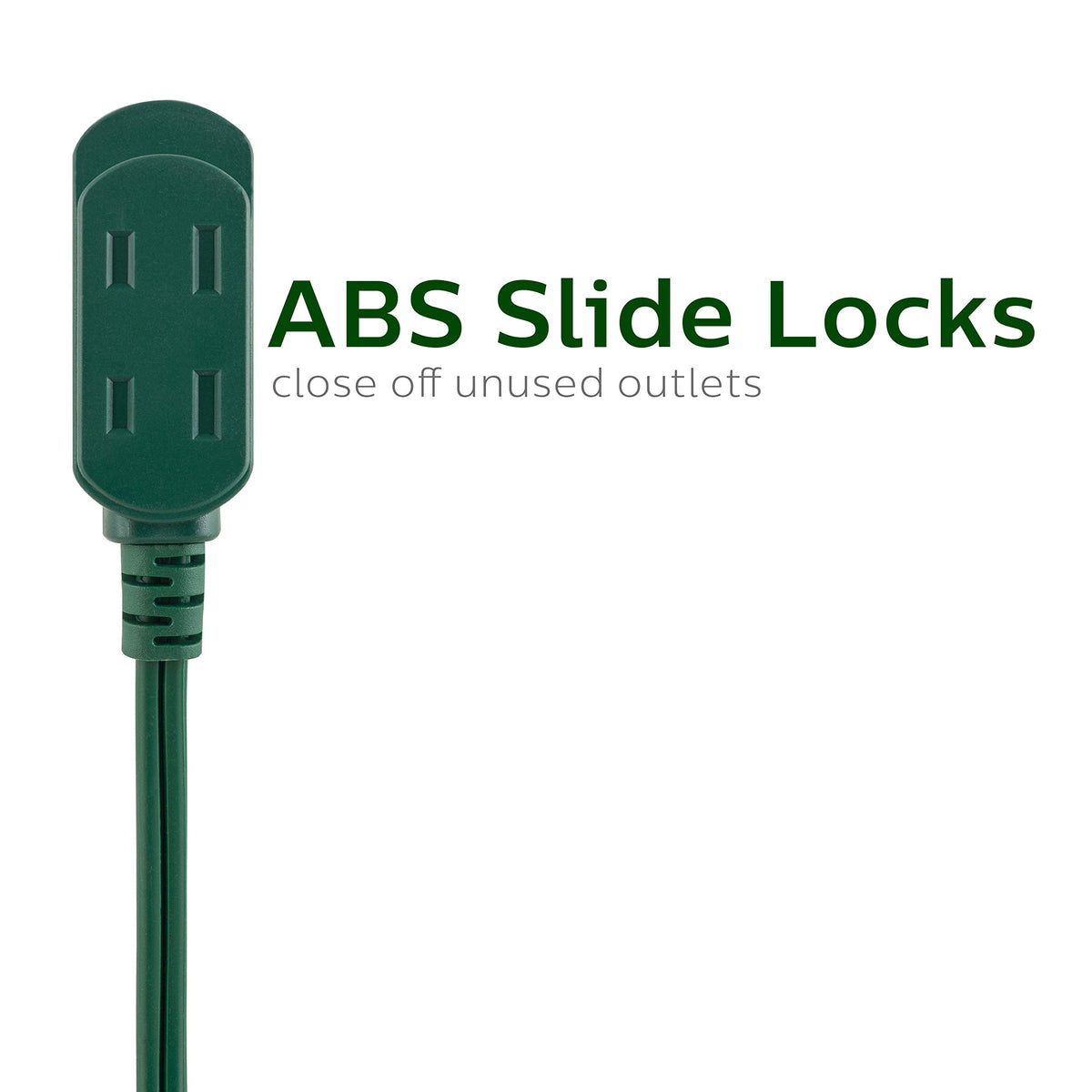 Q: What safety features does this extension cord have?A: This extension cord includes ABS slide locks that close off unused outlets, ensuring added safety for your home or office environment.