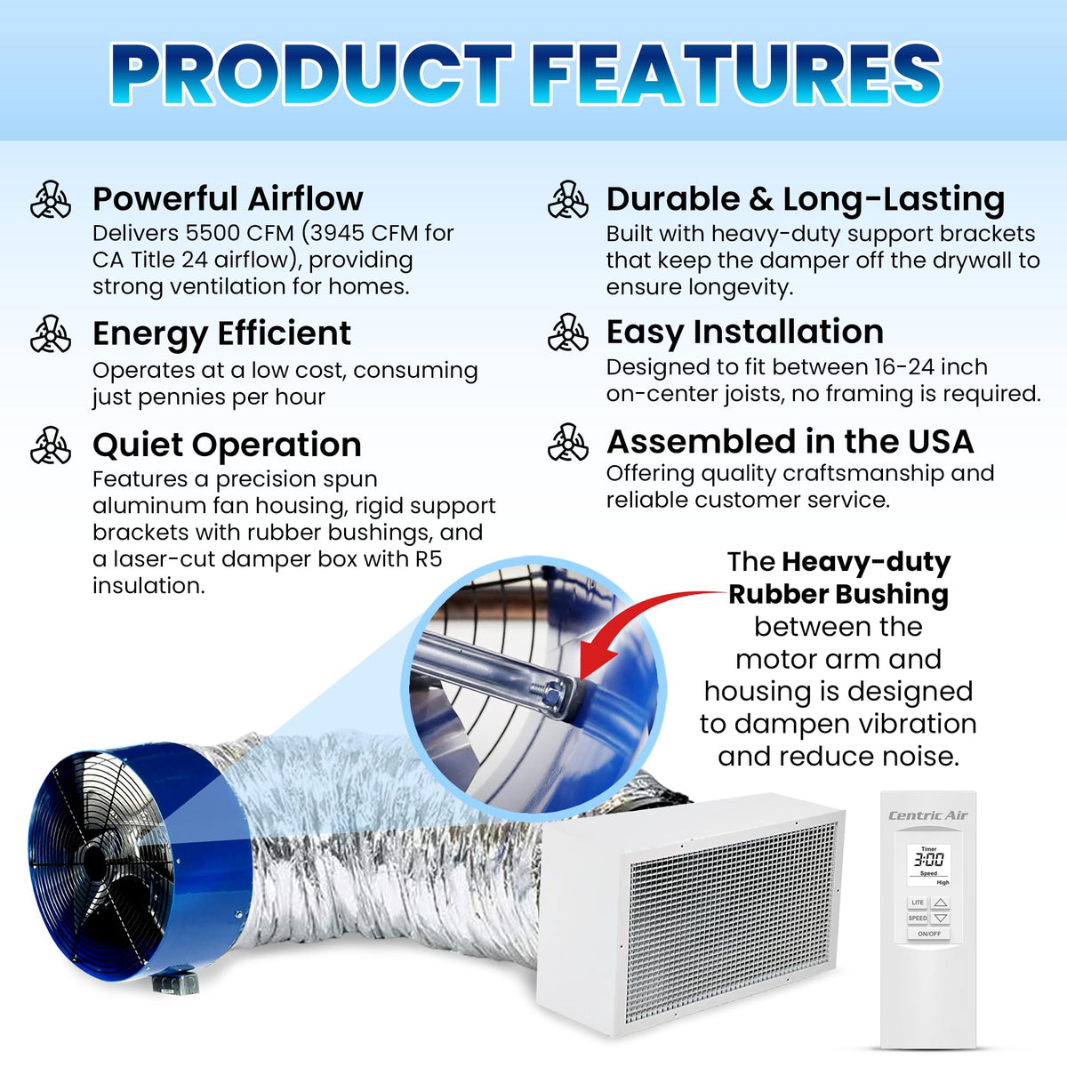 The Qa-Deluxe 5500 Whole House Fan Offers An Energy-Efficient Solution To Cool Your Home, Reducing Reliance On Air Conditioning And Lowering Cooling Costs. Designed For 2-Story Homes Up To 3400 Sq Ft And 1-Story Homes Up To 2400 Sq Ft, It Delivers Powerful Airflow With 5500 Cfm (3945 Cfm - Ca Title 24 Compliant), Featuring A 2-Speed Wireless Remote Control With A Timer For Easy, Flexible Operation. The R-5 Insulated Damper Helps Block Hot Attic Air When The Fan Is Off, Improving Energy Efficiency. Built For Durability With Easy Installation Between 16 To 24 On-Center Joists, It Comes With A 10-Year Motor Warranty And 3-Year Parts Warranty. Proudly Made In The Usa.