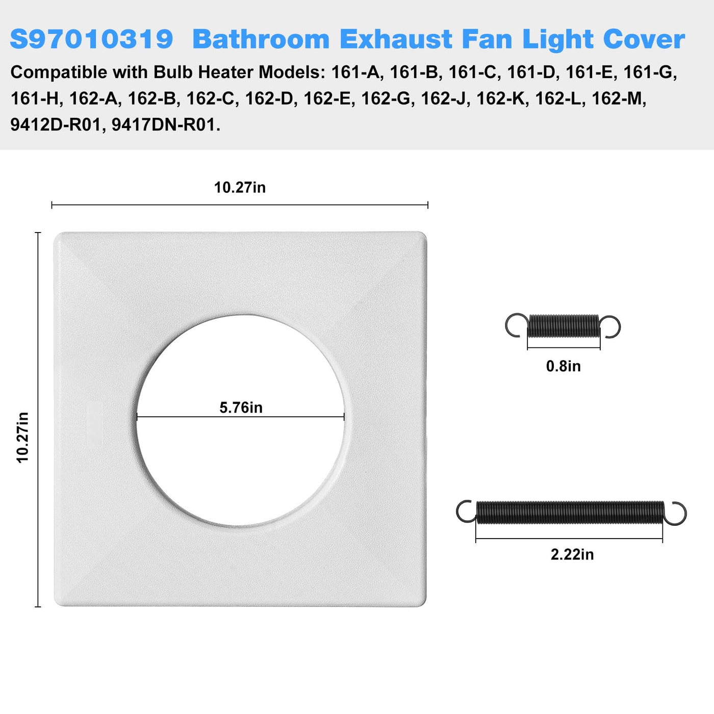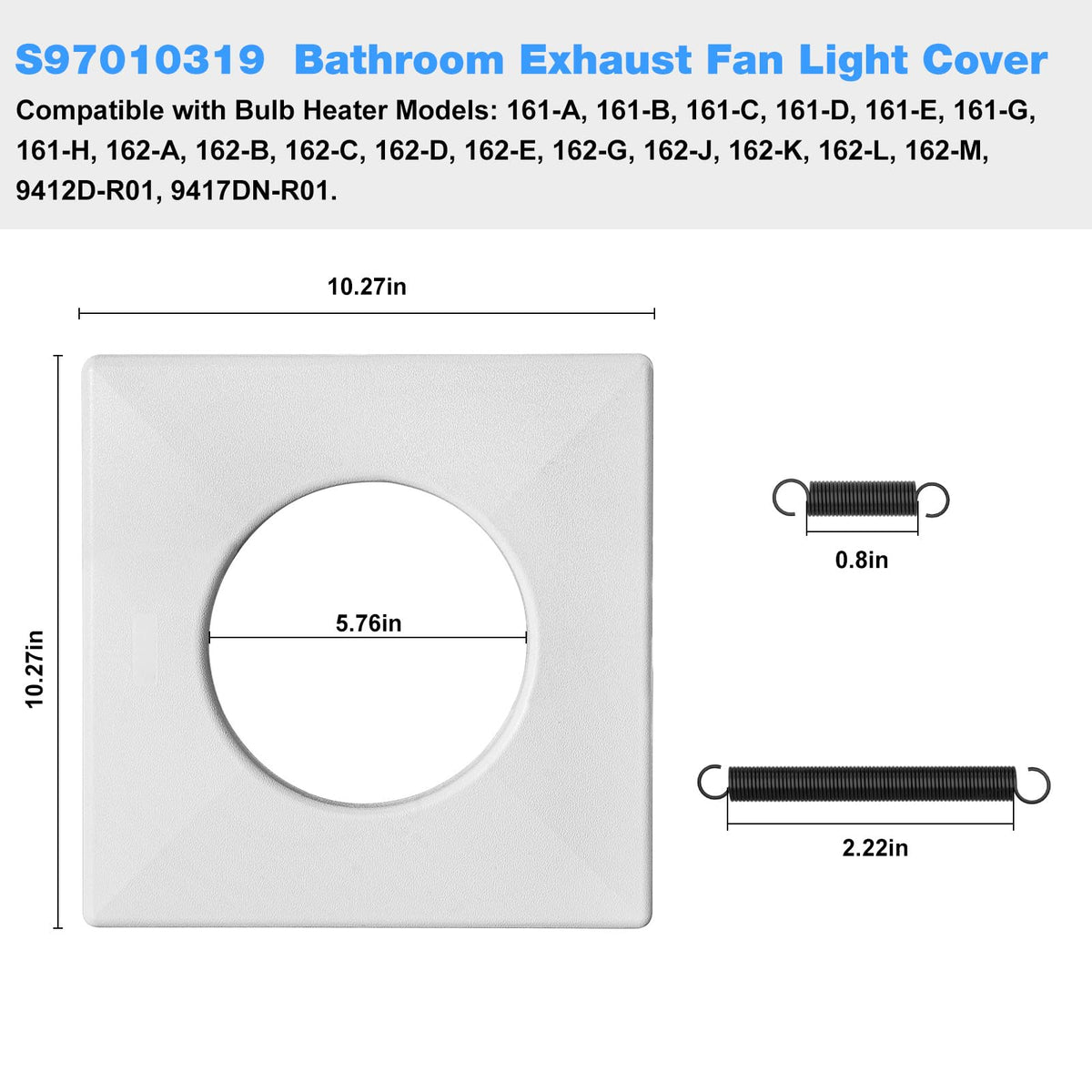 ?Exhaust Fan Cover Grille? For Broan Fan Grille Part Number: S97010319, 97010319, 99111347. The Fan Grille Is Designed To Allow Air To Flow While Preventing Debris From Entering The Ventilation System.. ?S97010319 Bathroom Exhaust Fan Cover? Compatible With Bulb Heater Models: 161-A, 161-B, 161-C, 161-D, 161-E, 161-G, 161-H, 162-A, 162-B, 162-C, 162-D, 162-E, 162-G, 162-J, 162-K, 162-L, 162-M, 9412D-R01, 9417Dn-R01. ?Durable Material? The S97010319 Exhaust Fan Grille Springs Is Made Of High-Quality Materials That Can Withstand The High Temperatures Generated By Lamp Heaters, Ensuring Long-Term Use And Safety. ?Easy Installation? Our Broan Exhaust Fan Lamp Cover Grille Is Quick And Easy To Install And Can Be Seamlessly Installed On Most Heating Lamps Without The Need For Specialized Knowledge And Tools. ?Enhanced Aesthetics? With A Sleek And Modern Design, The Broan Fan Lamp Cover Grille Not Only Serves A Functional Role But Also Enhances The Overall Appearance Of Your Space, Blending In With Various Decor Styles.