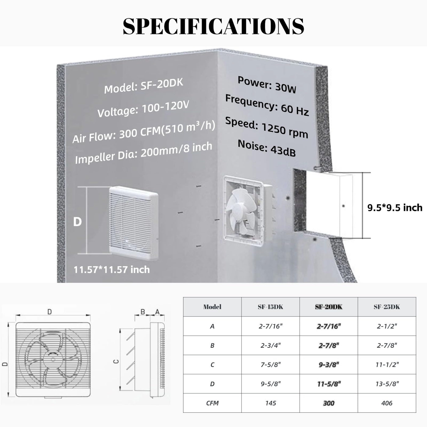 Sailflo 9.5 X 9.5 Inch Cutout Window Shutter Exhaust Fan With Reversible Airflow, 300Cfm 30W Wall-Mounted Quiet Ventilation Fan