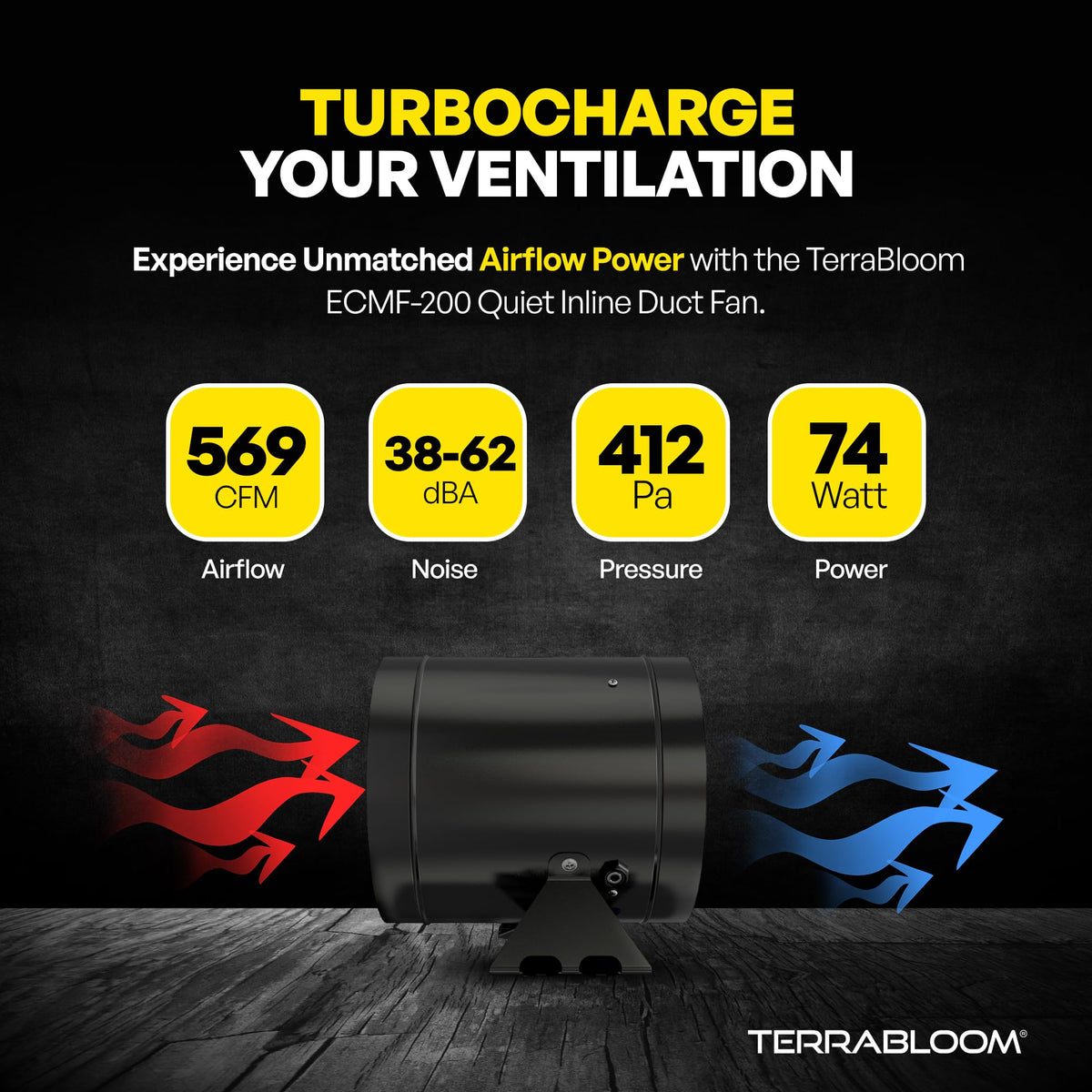 Terrabloom Ecmf 200, Quiet 8'' Inline Duct Fan With 0 100% Variable Speed Controller, Air Tight Metal Casing, Energy Efficient E