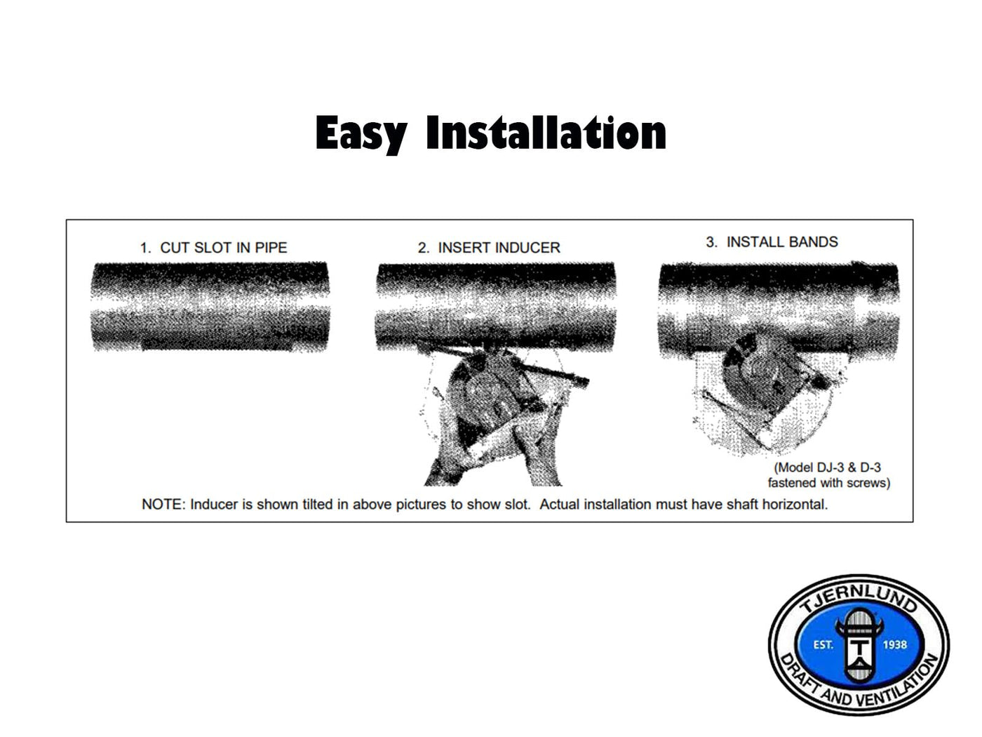 Tjernlund In-Line Draft Inducers Assure Positive Draft When Restricted Boilers And Furnaces, Poor Chimneys Or Negative Pressures In Buildings Prevent Proper Exhaust Of Combustion Gases. The Venturi Action Starts Air Moving Up The Stack Instantly & Keeps It Moving Smoothly. These Units Are Quick And Easy To Install And Completely Automatic In Operation. In-Line Draft Inducers Are Built For Long-Lasting, Trouble-Free Service And Available In Sizes And Capacities To Meet Virtually All Heating System Requirements. The Vari-Draft Control Permits Adjustment To Individual Job Requirements.