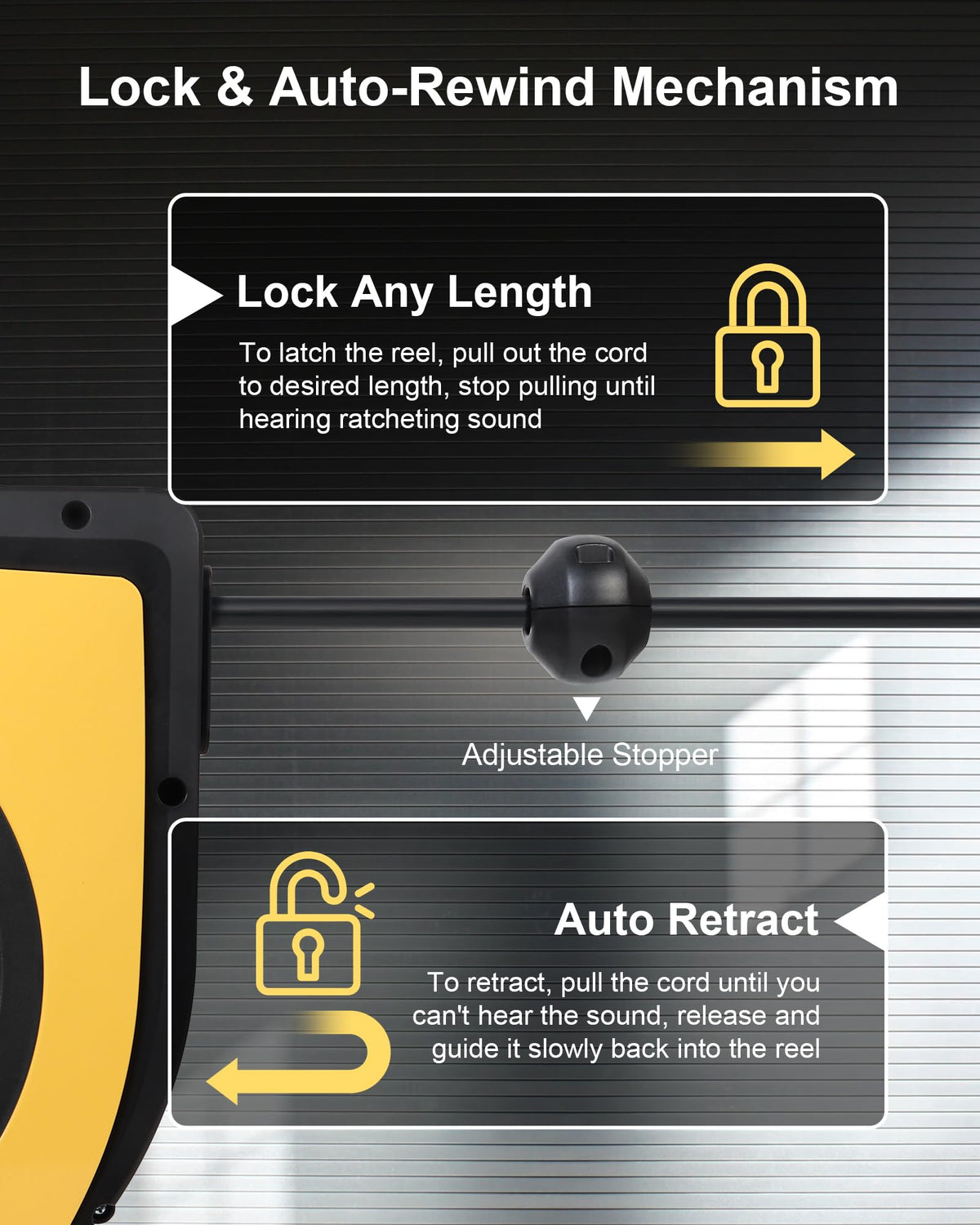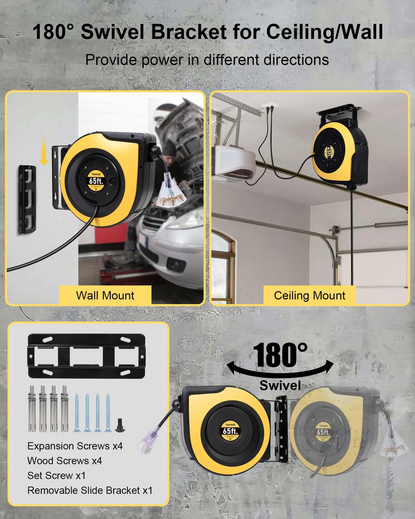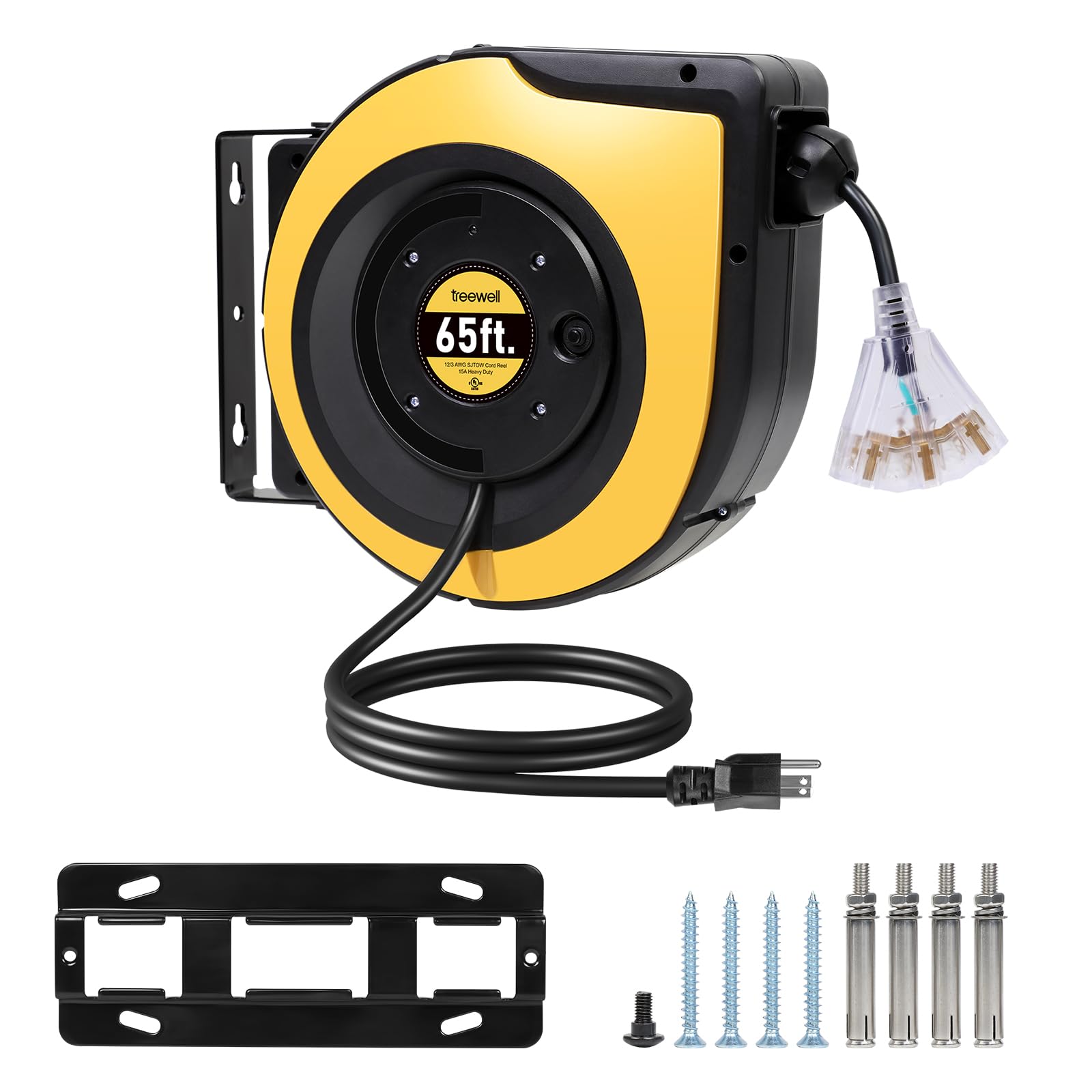 Introducing The Treewell 65 Ft Retractable Extension Cord Reel - A Must-Have For Any Garage Or Shop. This Ul Listed Cord Reel Comes With A Range Of Impressive Features That Make It A Handy Addition To Your Workspace.Firstly, It Is Solidly Constructed With A Hard-Impact Polypropylene Housing, Ensuring Durability And Longevity. The 65 Ft Retractable Cord, Combined With The 4.5 Ft Lead-In Cord With A Lighted Triple Tap, Provides Ample Reach For Your Power Needs.Say Goodbye To Tangled Cords And Manual Winding With The Automatic Retractable Feature. This Clever Mechanism Locks At The Desired Length And Smoothly Retracts When Not In Use. It Minimizes Tangling And Reduces Clutter, Saving You Time And Effort While Keeping Your Space Tidy And Organized.The Sjtow Durable Cord Is Flame Retardant, Tangle-Free, And Resistant To Abrasion, Water, Oil, Uv Light, Ozone, Alkaline, And Acid. It Maintains Flexibility And Durability In Even The Toughest Temperatures, From -58F To 221F (-50C To 105C), Ensuring It Meets Your Needs In Any Environment.With Its Heavy-Duty 12Awg/3C Construction, This Extension Cord Can Handle Higher Current Draws, Providing A Stable And Consistent Power Supply Even For High-Powered Devices. The Built-In 15A Circuit Breaker Adds An Extra Layer Of Safety For Your Peace Of Mind.Installation Is A Breeze With The 180 Detachable Swivel Bracket, Allowing Easy Mounting On Walls Or Ceilings. Its 180-Degree Swivel Capability Provides Quick And Convenient Access To Power Tools And Equipment From Various Directions, Simplifying Your Garage Work.When Not In Use, The Cord Reel Can Be Effortlessly Stored, Keeping Your Workspace Neat And Organized. Upgrade Your Garage Or Shop With The Treewell 65Ft Retractable Extension Cord Reel And Enjoy The Convenience And Reliability It Brings To Your Power Needs.