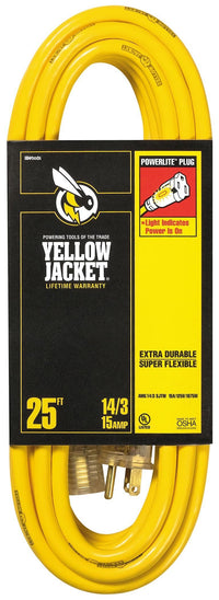 Yellow Jacket 2886 14/3 Heavy-Duty 15 Amp Sjtw Contractor Extension Cord With Lighted Ends Are More Flexible And Abrasion Resistant At Any Temperature Than Standard Vinyl Compounds. High Gloss Yellow Jacket Resists Oil, Grease, Moisture And Abrasion. Extra Heavy, Clear Molded Plugs Are Rugged, Durable And Oversized. Recommended For Use With Heavy Duty Equipment And Tools. General Information Manufacturer: Southwire Incorporated Manufacturer Part Number: 2886 Brand Name: Southwire Product Name: Power Extension Cord Product Type: Power Extension Cord Technical Information First End Connector Type: Nema 5-15P Power Description Voltage Rating: 125 V Ac Current Rating: 15 A Physical Characteristics Product Color: Yellow Cord Length: 25 Ft Weight (Approximate): 2.36 Lb Miscellaneous Country Of Origin: China Warning: Cancer And Reproductive Harm - Www.P65Warnings.Ca.Gov.