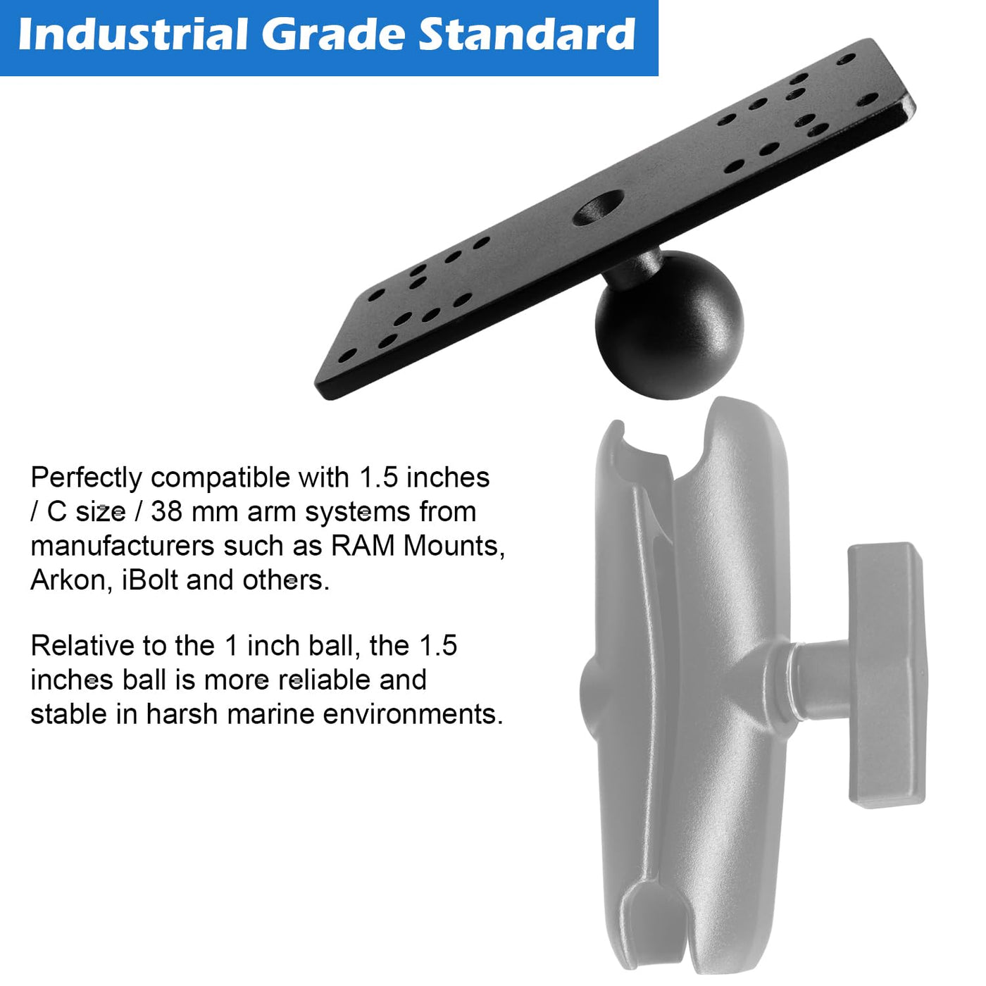 Superior Compatibility - 1.5 Ball Universal Mounting Plate For Fish Finder, Gps Chartplotters And More. Perfectly Compatible With 1.5 Inches / C Size / 38 Mm Arm Systems From Manufacturers Such As Ram Mounts, Arkon, Ibolt And Others. (Complimentary Stainless Steel Screws) Designed For Marine Environment - Constructed From Powder-Coated Marine-Grade Aluminum And Tested For Thousands Of Hours In Salt Spray To Ensure Reliability And Stability In The Harshest Environments. 1.5'' Ball Made Of Marine-Specific, High-Strength Composite Material That Is More Resistant To Corrosion Than Industrial Rubber Coatings. Longer Service Life - The Ball And Mounting Plate Are Molded In One Piece, Rather Than Screwed Together, For Longer Service Life And To Ensure The Stability Of The Device. Relative To The 1'' Ball, The 1.5'' Ball Is More Reliable And Stable In Harsh Marine Environments.