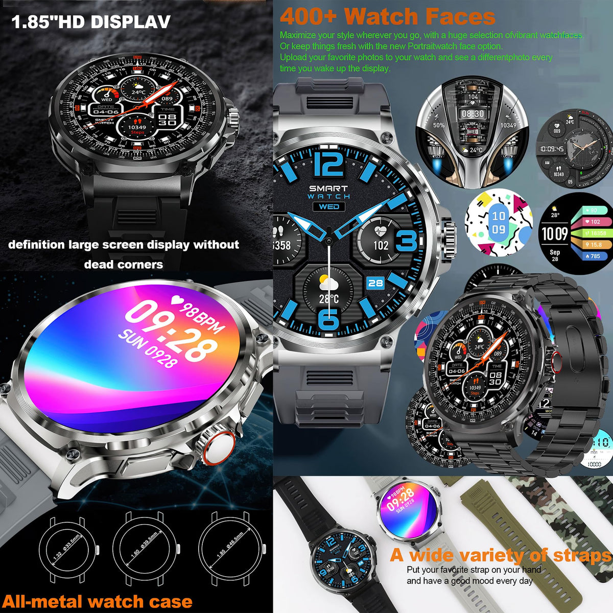 1.85 '' Round Hd Military Smart Watch For Men(Make/Answer Call), Tactical Fitness Tracker Smartwatch For Android Iphones, Outdoor 5Atm Waterproof Digital Watches Step Counter, 2 Straps, Comes With 1 Stainless Steel Watchbands And 1 Silicone Watchbands Why Choose Zpimy Smart Watch? 1. Fitness Tracker Smartwatch: Through Bluetooth 5.0, This Smart Watch Can Receive Any Information, You Will Never Missing Any Messages. 2. Stylish And Simple Appearance, 1.85 '' Hd Full Touch Screen: Easy Control With The Sensitive Touch Screen.Watch Screen Will Light Up Every Time You Raise Your Hand. 3. Music Playback And Control, Remote Photography: When The Watch Is Connected To The Phone, You Can Control The Watch To Play And Pause The Song, Or Switch To The Next And Previous Song. Free Your Hands And Record Beautiful Moments. 4. Step Tracker Watch: Display Steps, Calorie, Distance, Heart Rate. 5. 100+ Multi-Sport Modes: Such As Daily Walking Pedometers, Running, Biking, Hiking, Skiing, Basketball, Soccer, Badminton, And Baseball, Etc. 6. Heart Rate/Blood Pressure/Blood Oxygen Monitor Watch: 24 Hours Continuous Monitoring. 7. Sleep Monitor Watch: Automatically Monitor And Analyze Sleep Quality During Night. 8. Smart Reminder For Information: With All Notifications Displayed On Your Wrist And Alerted By Vibration, You Can Keep Your Phone In Your Pocket Without Missing Any Important Calls Or Messages When You 'Re Out Walking, Exercising, Or Seeing Friends. 9. 5Atm Water Resistant Smart Watches: With The Technology Of Waterproof, The Rugged Smart Watches For Men Will Not Be Damaged Even If You Wash Your Hands And Do Sports While Wearing The Fitness Watch Meet Your Daily Needs. 10. More Features: Brightness Adjustment, Find The Phone, Find Watch, Weather, Alarm, Stopwatch, Timer, Sedentary Reminder. What 'S In The Package? Smart Watch With Silicone Strap *1 Stainless Steel Watchbands*1 Charging Cable*1 Manual*1(English, French, Spanish, German, Italian)