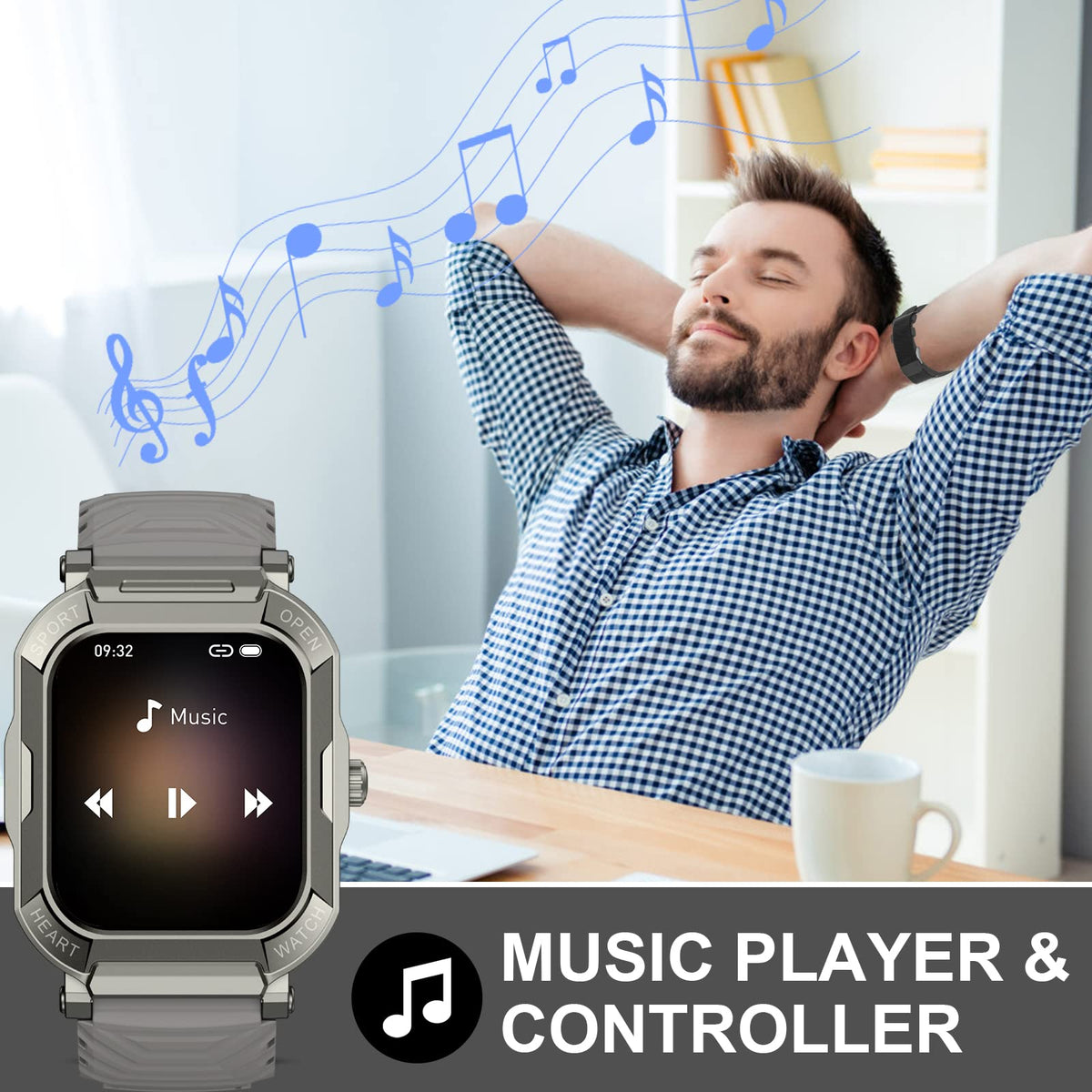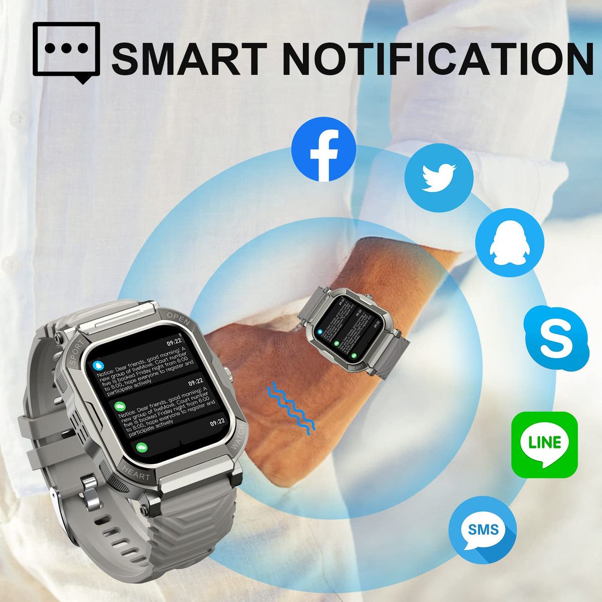 Military Smart Watch *Fitness Tracker,1.91-Inch High-Definition Large Color Screen *Call Reminder / Can Hang Up The Call Reminder *Phone Call On The Watch (Via Bluetooth) *Message Display (Only Receive) *Real-Time Heart Rate/Pressure Blood/Oxygen Monitoring *113 Professional Sports Modes *Sports Data Analysis *Music Player *Real-Time Messages Notifications *Support Multi-Languages Auto-Sync *Health Monitoring *Voice Assistant *Ip67-Grade Waterproof