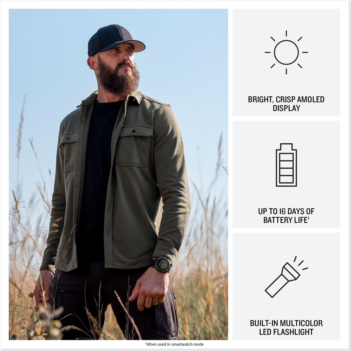 Q: What are the key features of the Garmin tactix® 8 smartwatch?A: The Garmin tactix® 8 smartwatch features a stunning 1.4” AMOLED display, a durable titanium bezel, and a sapphire lens. It includes advanced tactical capabilities such as a jumpmaster activity, waypoint projection, stealth mode, and a preloaded Applied Ballistics solver. Additionally, it provides extensive health monitoring, multi-band GPS with SatIQ technology, and up to 29 days of battery life in smartwatch mode.