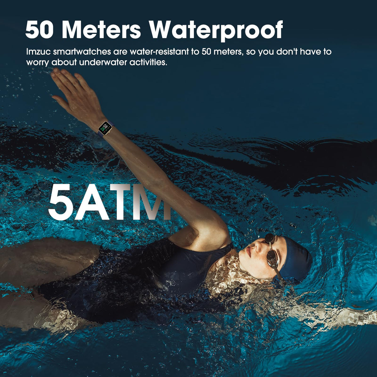 Q: Is the Imzuc Smart Watch waterproof?A: Yes, the Imzuc Smart Watch is waterproof with a rating of 50 meters. This means it can withstand sweat, hand washing, rain, and is suitable for swimming and diving activities.