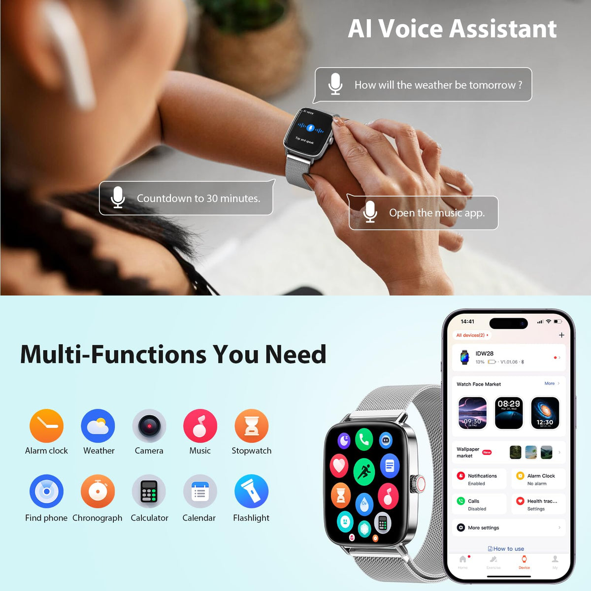 Why Yoever Smartwatch: Premium Design, Refined Craftsmanshi. Experience Next-Level Sophistication With Our 2025 Latest Smart Watch Design Featuring Metal Frame And 60Fps+ Ultra-Smooth Dynamic Screen. Choose From Two Interchangeable Bands Included For Versatile Style. Stay Connected On Your Wrist: Stay Seamlessly Connected To The Outside World. Powered By Faster, More Stable Bluetooth 5.3, Smart Watch Support Answer/Make Calls, Receive Texts/App Notifications, And Can Be Used With An Ai Voice Assistant At Your Service. (Note: Message Sending/Reply Functions Not Supported) Accurate Health Monitoring: High-Precision Sensors Provide 24/7 Monitoring Of Heart Rate, Spo2, Stress Levels, And Sleep Quality (Tracking Deep Sleep, Light Sleep, And Wake Times). It Analyzes And Enhances Your Health In The Form Of Data To Guard Your Health. Premium Fitness Partner: This Fitness Tracker Supports Up To 110+ Mainstream Exercise Modes, Acquires Advanced Metrics For Various Workouts, And Tracks The Intensity Of Your Workout.Its Ip68 Waterproof Rating Ensures Confidence During Aquatic Adventures Or Daily Use. Next-Gen User Experience: Glide Through Buttery-Smooth 1.85 '' 60Fps+ Touchscreen Animations. The Smart Watch For Women Has 200+ Dials To Choose From And Supports Personalized Custom Dials To Show Your Personality.&Nbsp; Enjoy 7-10 Days Of Use On A 2-Hour Charge. Life-Enhancing: Smart Health Reminders, Weather Forecasts, Alarms, Phone Locator, Timers, Music Control, And Dozens Of Other Daily Utilities - All Designed To Simplify Your Routine. Decade-Long Assurance: Your Satisfaction Is Our Priority. Every Yoever Smartwatch Includes A 10-Year Warranty And Lifetime Technical Support. Contact Us Anytime For Unparalleled Service.