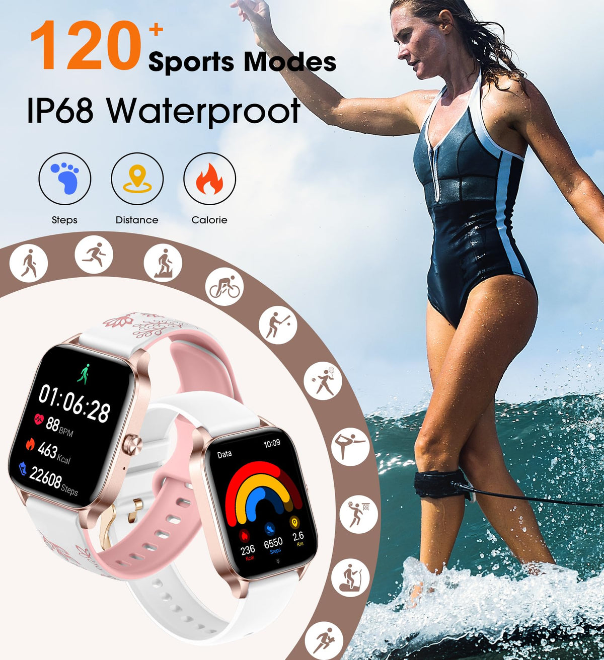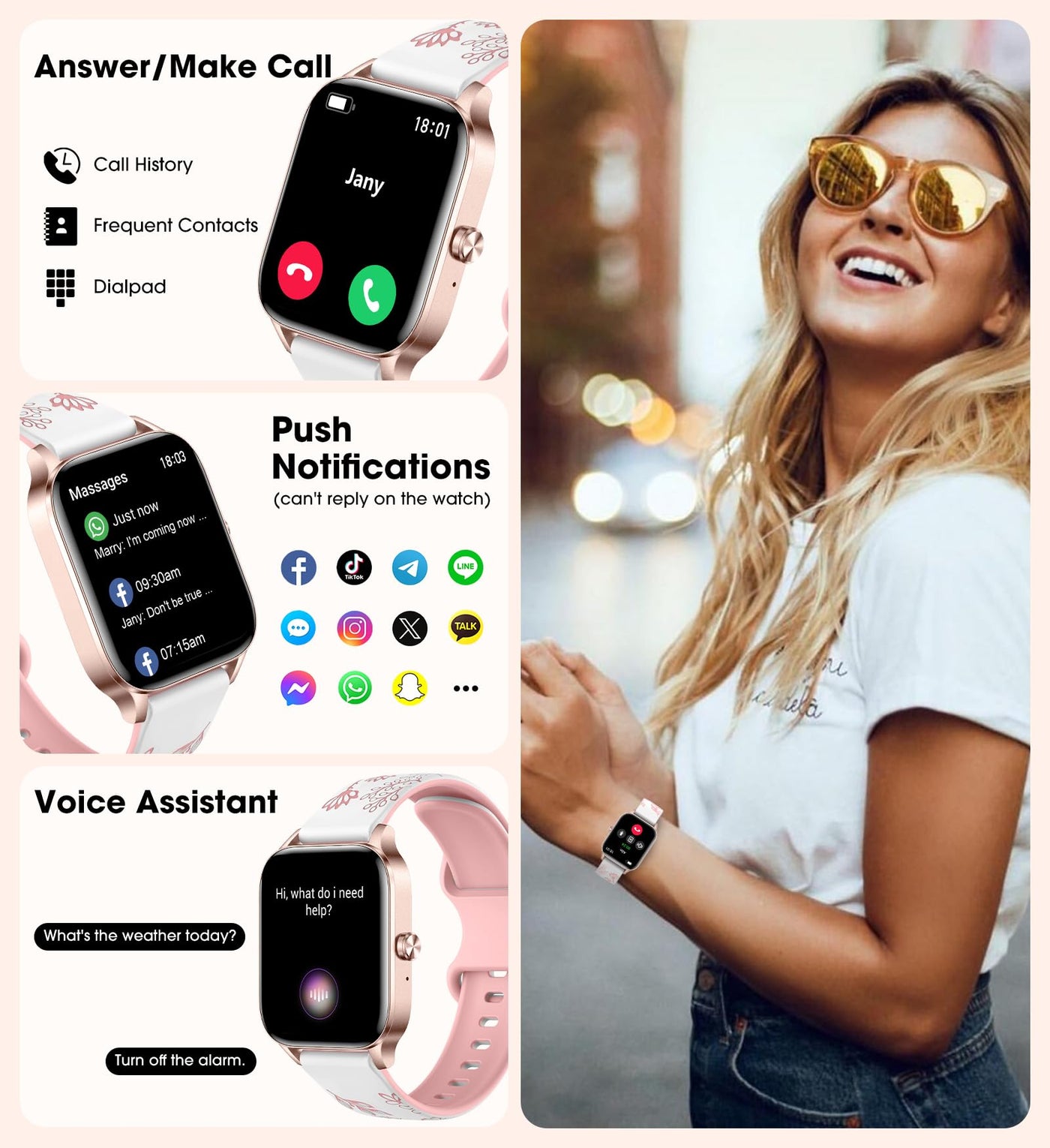 Innofovo Womens Smart Watches Are Seamlessly Compatible With Android And Ios Phones. Our Smart Watches For Women Not Only Support Bluetooth Calling (Answer/Dial) And Smart Ai Voice Assistant To Make Your Life More Convenient, But Also Provide Message Notifications To Check Information From Facebook, Whatsapp, Instagram, Email, And More Without Taking Out Your Phone. (Note: Cannot Text Back On The Watch) The Reasons Why Choose Our Watches: *24/7 All-Day Health Monitoring: Our Ladies Smart Watches Support Heart Rate Monitor, Blood Pressure Monitor, Blood Oxygen Monitor, And Sleep Monitor, Tracking Every Aspect Of Your Body From Day To Night, Giving You An Accurate Overview Of Your Health. Moreover, There Are Also Sedentary Reminders, Drinking Water Reminders, And Especially Womens Health Functions To Give You The Most Meticulous Care In Your Busy Daily Life. *Bluetooth Call Smart Watch: After Connecting To Your Phone Via Bluetooth, Our Smart Sports Watch Supports Bluetooth Calls, You Can Directly Use The Watch To Answer/Make Calls. *10 Frequent Contacts: Watches For Women Supports Adding Up To 10 Frequently Used Contacts To The Watch On The ''Fitcloudpro '' App For Easy One-Touch Calling. *Call Records: Every Call Will Be Recorded On The Watch And You Can View It At Any Time. *3 Chic Straps: 1 White Silicone Strap, 1 Pink Silicone Strap, And 1 Lavender Silicone Strap Are Not Only Comfortable To Wear, But Also Beautiful To Look At. No Matter What You Wear, It Will Complement You! *Activity Tracking: Featured With High-Performance Sensors, The Step Watches For Women Will Accurately Track And Record Your Daily Steps, Calories, And Distances, Getting Data Directly On Your Wrist To Help You Easily Adjust Your Lifestyle. *100+ Sports Modes: Innofovo Smart Watch For Women Supports 100+ Sports Modes Including Walking, Cycling, Running, Yoga, Golf, Badminton, Jumping Rope, Etc, Which Meet The Needs Of Most Sports Enthusiasts. *Music Control: You Can Control Play/Pause/Previous/Next Music Directly On The Smartwatch When The Watch And Phone Are Connected Properly. *Camera Control: Use The Watch Control To Take Photos And Easily Record All The Beautiful Moments In Your Life And Travel! *Weather Forecast: You Can Always Check The Weather On Your Wrist, No Longer Be Annoyed By The Frequent Weather Changes, Be A Prepared Person! *Alarm Clock: You Can Add Up To 5 Alarms To Your Women 'S Digital Smartwatch On Fitcloudpro App, No Longer Worry About Missing Important Meetings/Appointments! *Calculator: Our Smartwatches Also Have A Calculator Function That Is Not Found In Regular Watches, Which Is A Genuine Assistant In Daily Life! *Find Phone: Get This Android And Ios Smartwatch And Never Get Stuck Looking For Your Cell Phone Again! *Powerful Battery Life : This Smartwatch Boasts An Impressive Battery Life, Battery Capacity 300 Milliamp Hours,Lasting Up To 7 Days On A Single Charge, And 30 Days On Standby, Single Charge Time Only 2-3 Hours.