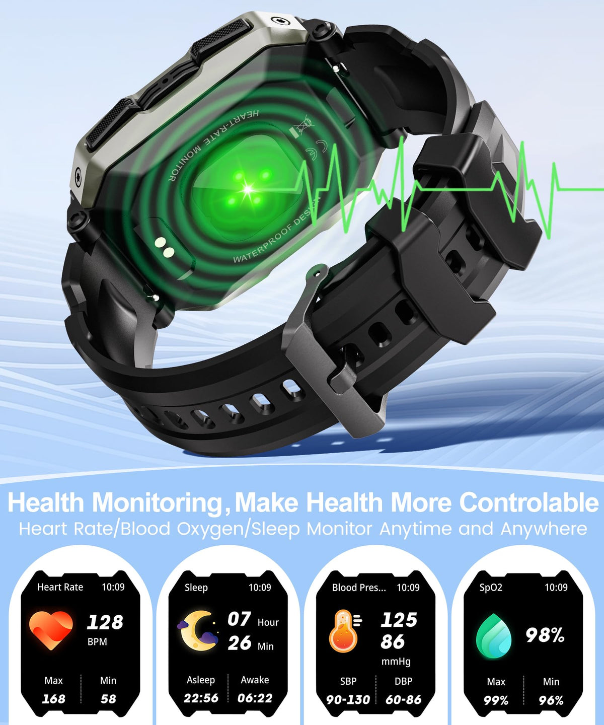 Q: What health monitoring features does this smartwatch offer?A: The smartwatch provides 24-hour health monitoring, including heart rate, blood pressure, blood oxygen levels, sleep analysis, and stress monitoring, allowing you to track your health anytime.