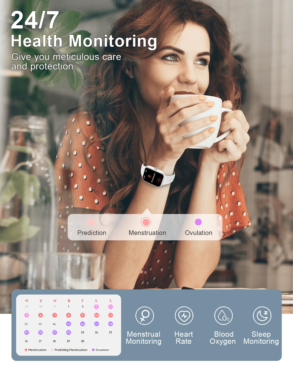 Fitoncloud Smart Watches For Women Adopts A 1.83-Inch Ultra-Clear Enhanced Eye Protection Screen, The Sportive Design And Lightweight Rectangular Dial Is Combined With 2 Breathable Straps Of The Same Color But Of 2 Different Styles (Always In Silicone/Plastic), 2 Straps That Can Be Interchangeable According To Taste, Which Is Perfect For Different Women 'S Styles. The Touchscreen Is Sharp And Vibrant, Making It Easy To Read Even In Direct Sunlight. The Interface Is Intuitive And Easy To Navigate, Allowing You To Quickly Access Your Favorite Apps And Features. Bluetooth 5.2 For Rapid Connection. You Can Receive And Read Messages, Receive Calls, The Water Reminder (Whatsup, Viber Etc.) And Move Around, Which Can Be Very Useful When You Get Stuck Reading And Even Forget What Time It Is. The Comfortable Smartwatch Is Equipped With High-Precision Sensors And Supports 24-Hour Heart Rate Monitoring, And Blood Pressure And Spo2 Monitoring And Menstrual Monitoring. Thanks To Real-Time Data, Women Can Know Their Heart And Health Status In Time. It Can Monitor And Analyze Sleep, Combined With Changes In Cycle Data, Help Women Scientifically Improve Their Sleep Patterns. With Over 120 Sports Modes, Its Very Easy To Track Your Daily Activity. Large Face And Great App! Allowing To Choose From And Even To Personalize It Yourself With A Photo Or Drawing. There Are Lots Of Other Options Like Listening To The Music, The Calculator, The Weather, Stopwatch Etc... Thanks To The Qr Code, I Installed The App And The Bluetooth Connection To My Mobile Phone Also Worked Smoothly. Ios Or Android - Compatible. The Battery Life Is Very Good, Which Means You Can Use The Watch For Days Without Worrying About Constantly Charging It. Before Using The Smartwatch, You Should Fully Charge It First. To Do This, You Have To Connect The Magnetic Charging Cable To A Usb Charger And Then Dock It At The Charging Points On The Smartwatch.