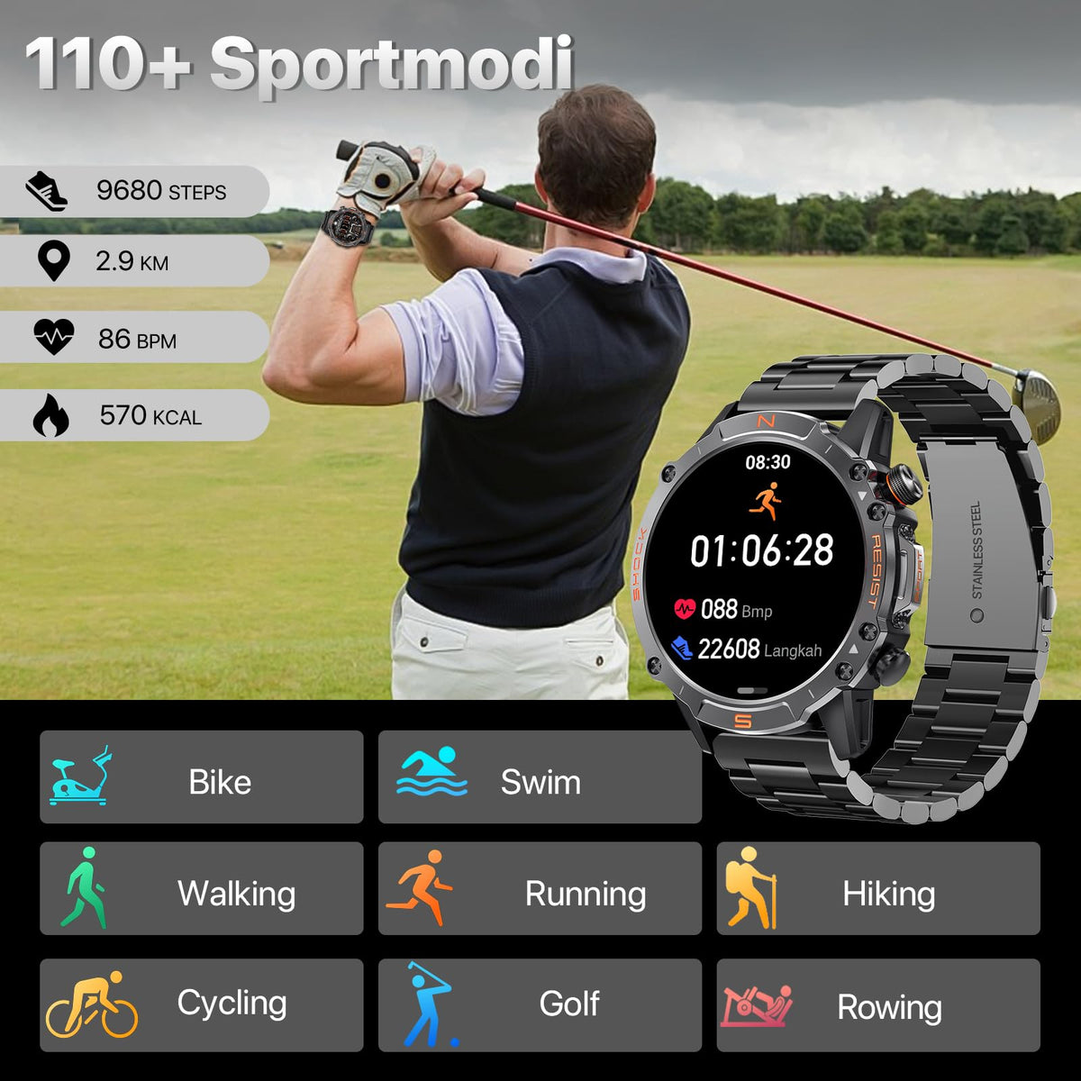 Walkerfit Smart Watch For Men Answer/Dial Calls With 110 Sport Models, Ip68 Waterproof Fitness Watch With Heart Rate Monitor, Android Smart Watch For Iphone Compatible, 1.43'' Amoled Display, Stainless Steel Black Band