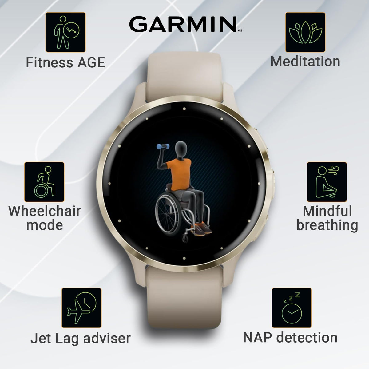 Q: How does the Wheelchair Mode work on the Garmin Venu 3S?A: The Wheelchair Mode on the Garmin Venu 3S tracks pushes instead of steps and includes preloaded workouts for handcycle activities. It also offers animated workouts designed for strength, cardio, HIIT, yoga, and pilates, catering specifically to wheelchair users.