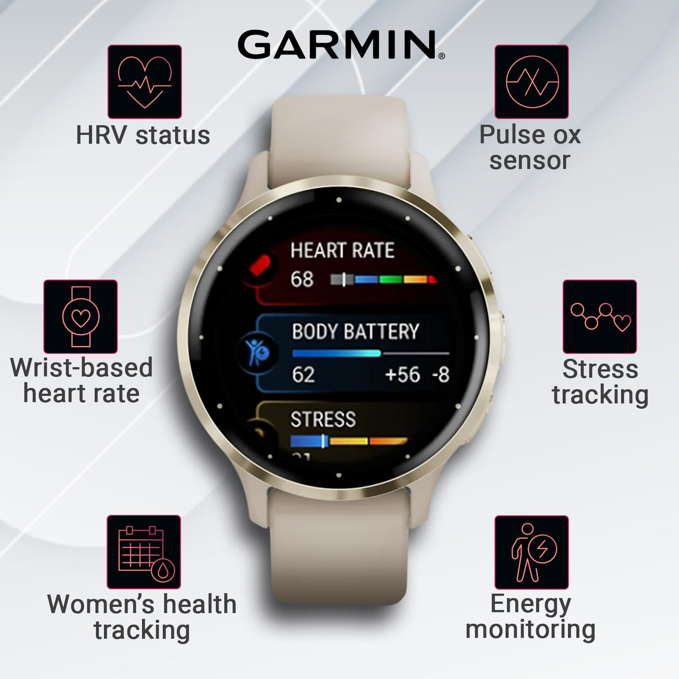 Q: What health features does the Garmin Venu 3S GPS Smartwatch provide?A: The Garmin Venu 3S smartwatch offers extensive health monitoring features, including wrist-based heart rate tracking, Body Battery energy monitoring, sleep score and coaching, stress tracking, and menstrual cycle tracking. It helps users gain insights into their health and wellness.