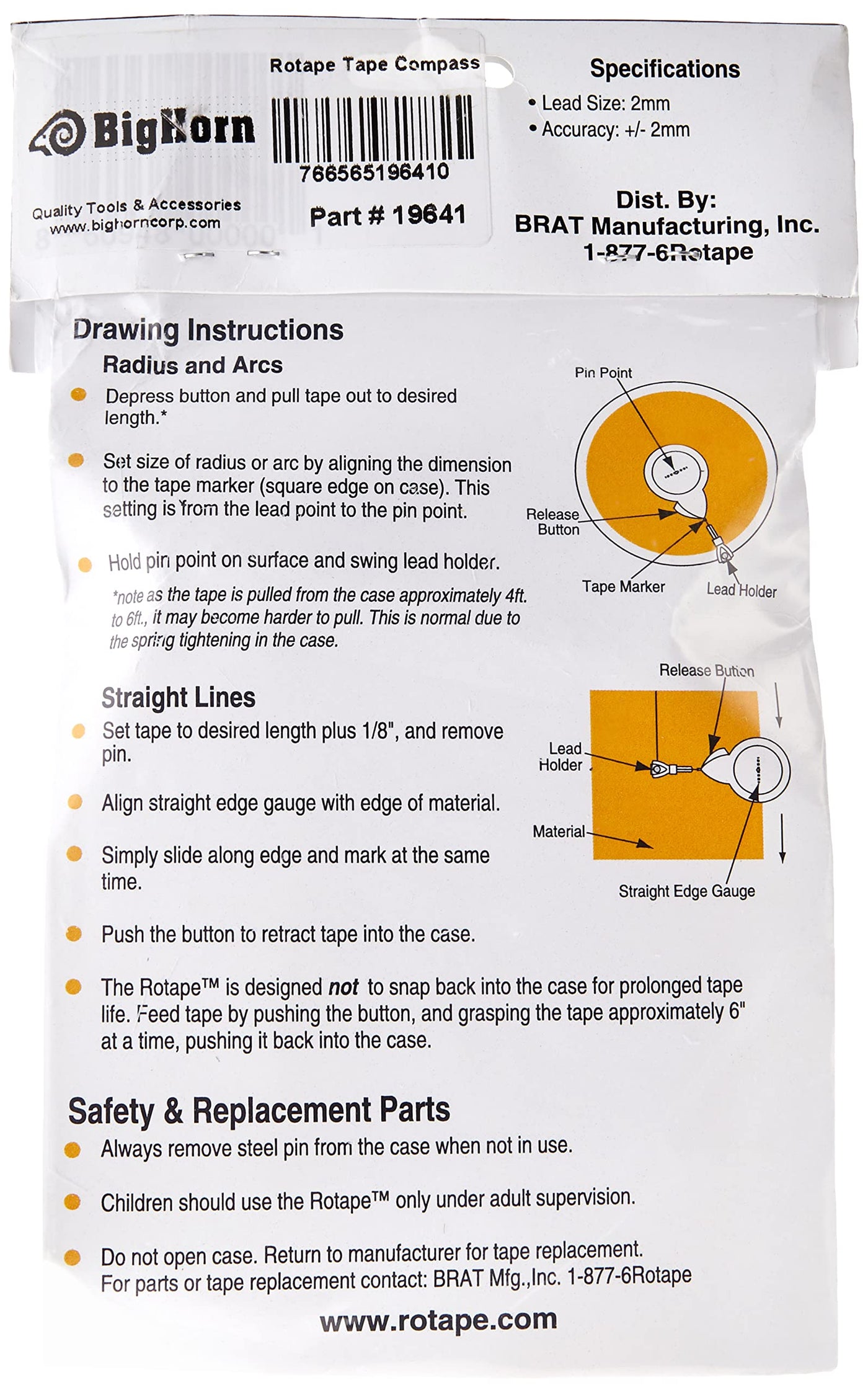 Product Descriptionrotape Compass (3-1/2 Inch To 6 Feet Capacity)From The Manufacturerbig Horn'S 19641 Is The Original Rotape Beam Compass From Brat Manuf. This Marking Device Combines A Measuring Tape And Pencil Scribe In One Pocket Size Tool. It Makes A Radius From 3-1/2-Inches To 6-Feet. It Also Can Be Used To Mark Straight And Parallel Lines, Arcs, And Circles. Use On Wood, Steel, Concrete, Drywall, Fabric, Chalkboard, And More. Includes Centering Pin, Collett And Pencil Lead. Replaces The Standard Beam Compass And Trammel Point Set. Made In Usa.