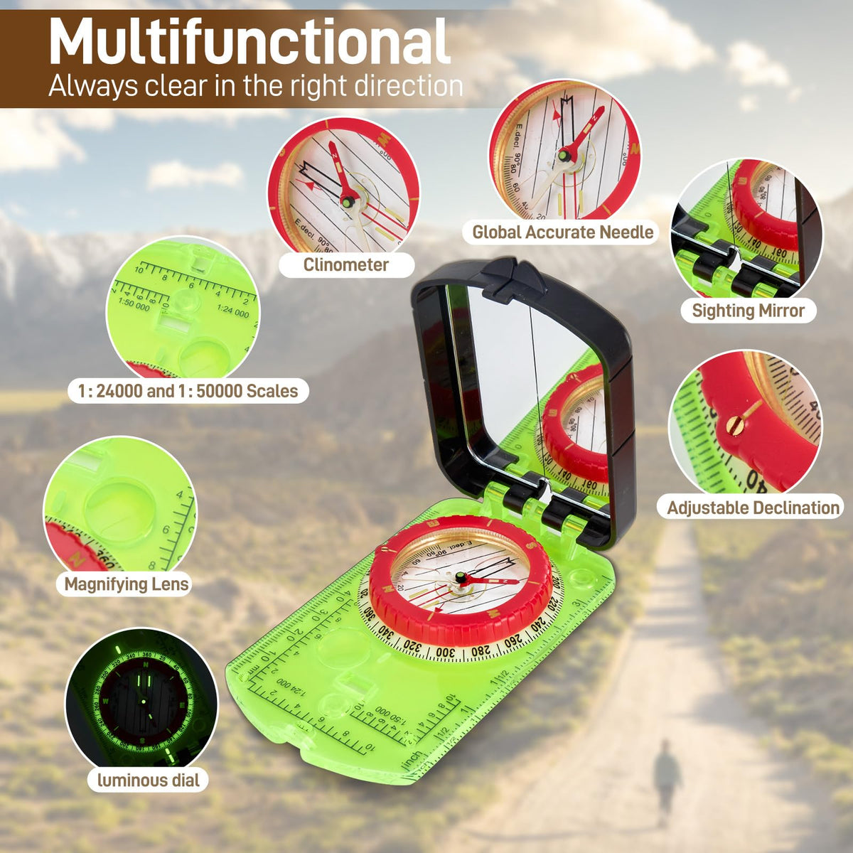 Sportneer Hiking Compass With Mirror - Orienteering Compass For Kids, Gifts, Hiking, Camping, Backpacking - Green