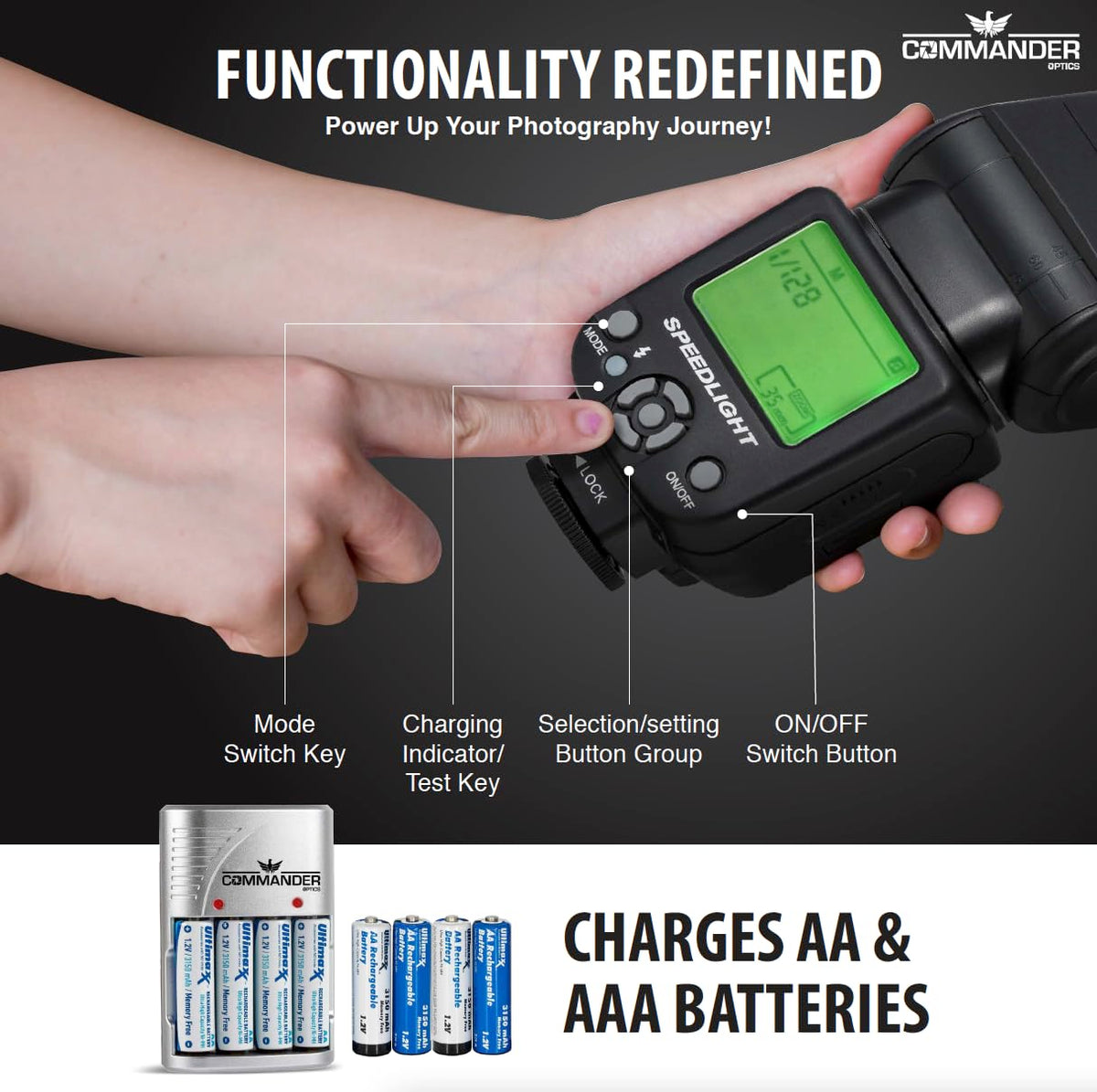 Commander Optics E Ttl Flash Speedlite Bounce/Swivel Led Backlit With 4 Rechargeable Aa Batteries For Canon Rebel T7, Sl3, 4000D