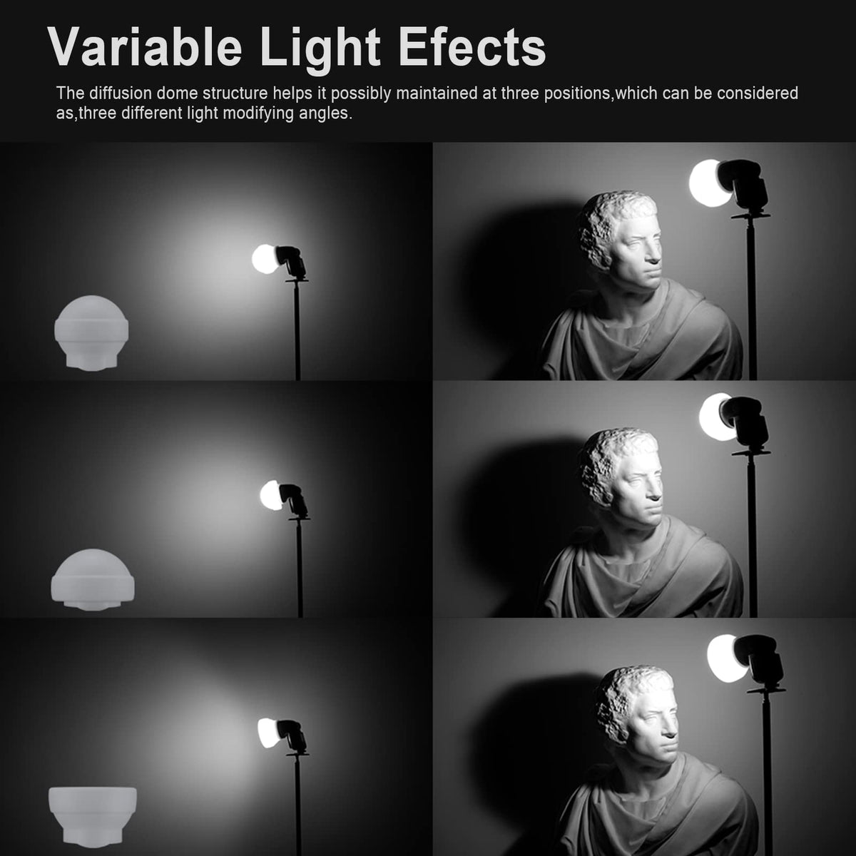 Q: Can the Godox AK-R22 Diffusion Dome be adjusted for different lighting effects?A: Yes, the Godox AK-R22 Diffusion Dome can be assembled in three different configurations, allowing you to create various light effects. You can fully extend it for 360-degree lighting, collapse the back for 180-degree diffusion, or adjust the front to customize the light quality for more dimensionality.