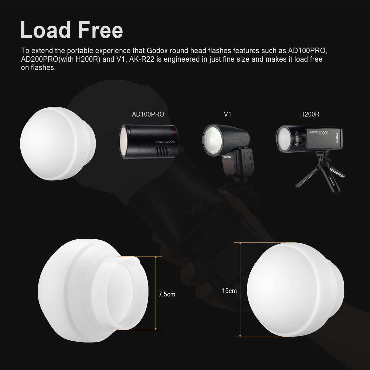 Q: What cameras or flashes is the Godox AK-R22 Diffusion Dome compatible with?A: The Godox AK-R22 Diffusion Dome is compatible with Godox V1 and V1 Pro series round head flash models, including V1-S, V1-C, V1-N, V1-O, V1-F, and V1Pro versions. It also works with Godox AD100Pro and AD200 Pro/AD200 pocket flashes, but please note that it requires the H200R adapter (sold separately) for use with AD200/AD200Pro.