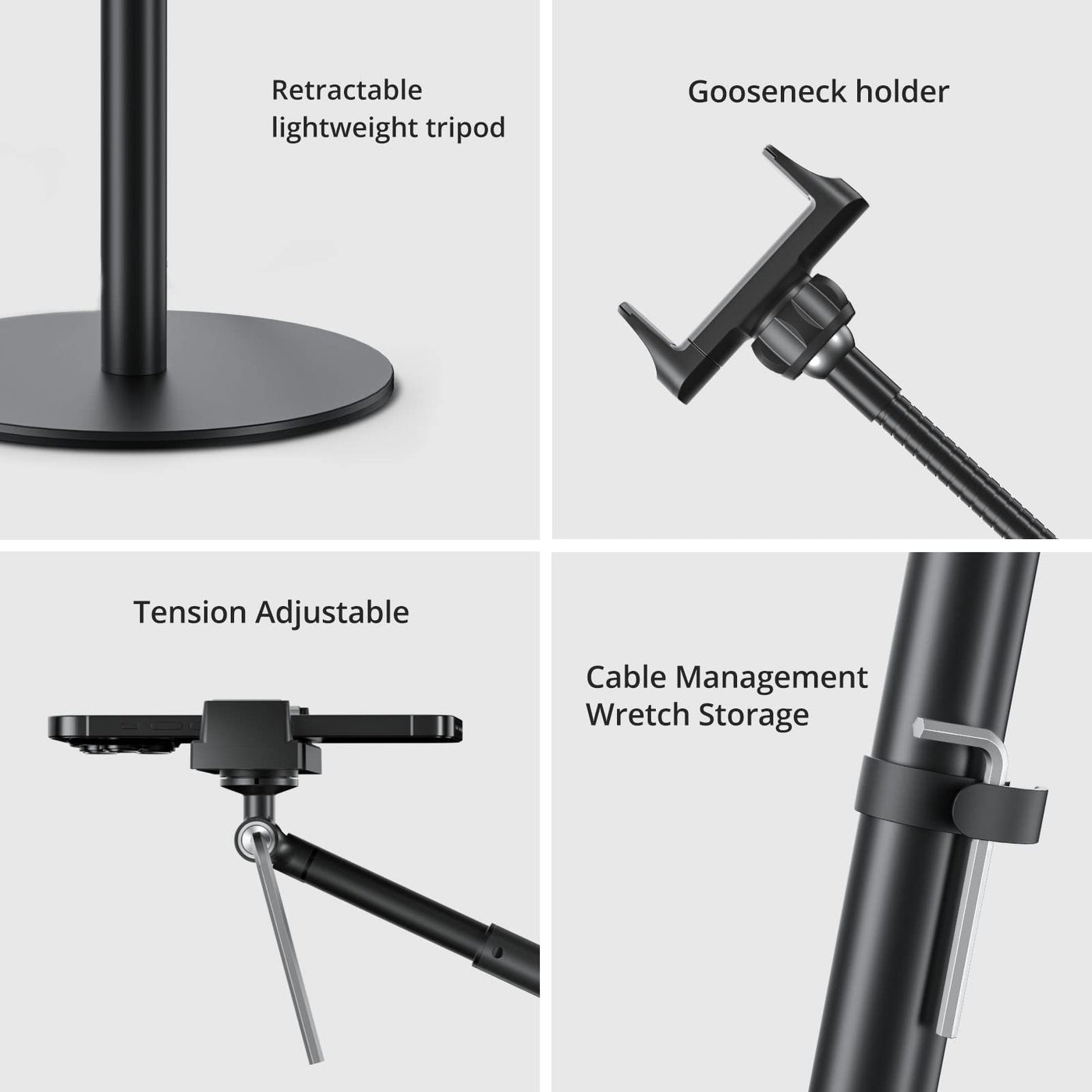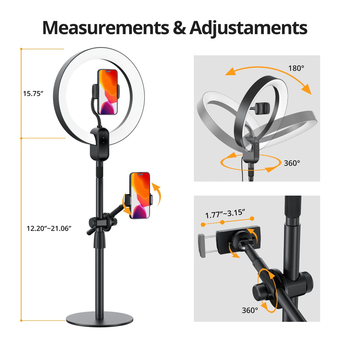 Q: How adjustable is the height and angle of the ring light?A: The SupeDesk ring light stand is highly adjustable, with a height range of 29.5" to 36.5" and an overhead arm that can retract from 11.5" to 18.5". Additionally, the ring light itself can tilt 180 degrees, while the cellphone holders can rotate 360 degrees and tilt 270 degrees.