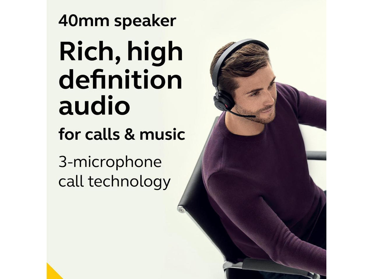 Q: What are the key features of the Jabra Evolve2 65 headset?A: The Jabra Evolve2 65 headset features superior passive noise cancellation, 40mm speakers for high definition audio, enhanced 3-microphone technology to reduce background noise, and up to 37 hours of battery life on a single charge. It also includes soft memory foam cushions for all-day comfort and is optimized for Microsoft Teams.