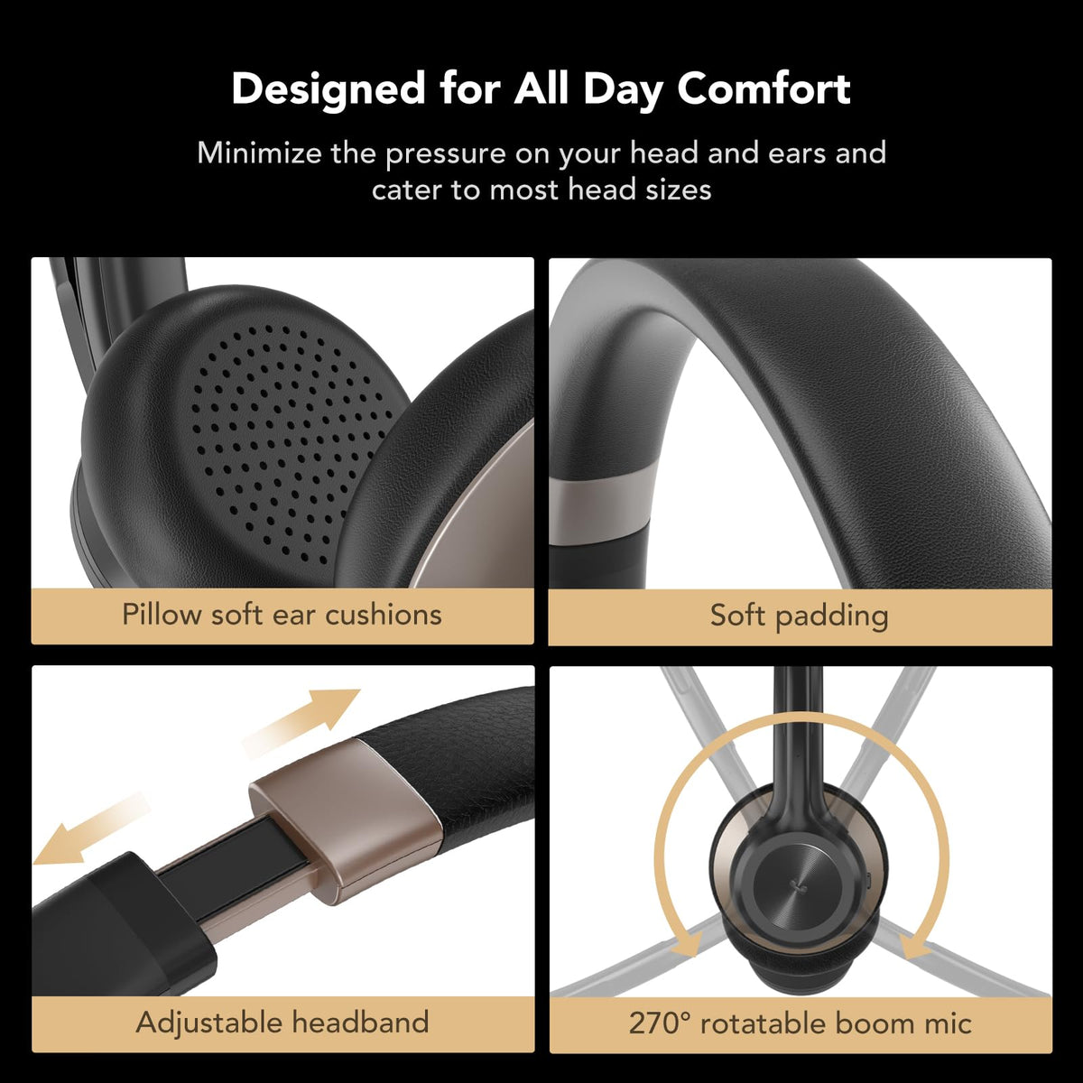 The Professional Wireless Headset Features Ecm+Mems Mics With Ai Noise Reduction And Dsp Denoise Technology, Eliminating 99% Of Echo And Offering An Easily Accessible Mute Button.&Nbsp;It Boasts Up To 40 Hours Of Playtime, 15 Hours Of Talk Time, And A 100-Ft Bluetooth Range With Fast 2-Hour Charging, All Thanks To Bluetooth V5.0. Designed For Comfort With Soft Ear Cushions, A Padded Headband, And A Lightweight Build, It Also Allows Flexible Mic Placement And Easy Volume Control.&Nbsp;It Supports Bluetooth, Usb-A, Type-C, And Dongle Connections, And Can Pair With Two Devices Simultaneously (Music From One, Calls From Both).&Nbsp;Compatible With Major Communication Platforms And Operating Systems, Its Ideal For Various Professional Uses, Backed By 24-Hour Online Customer Service.
