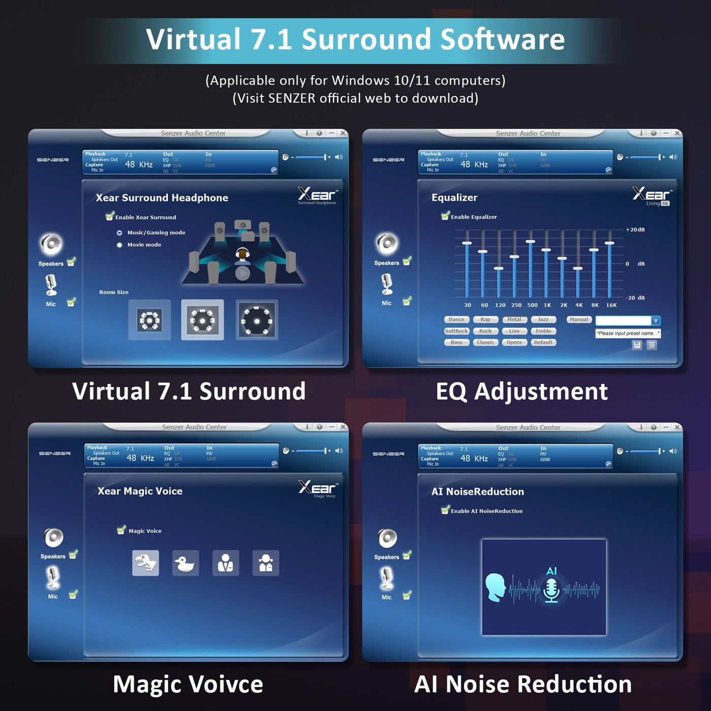 Q: What sound quality can I expect from the SENZER SG600 headset?A: The SENZER SG600 headset delivers an immersive audio experience with its 7.1 surround sound capabilities. It utilizes high-performance 40mm dynamic drivers for clear and lifelike sound reproduction, making it ideal for gaming where sound detail is crucial. The headset also includes a customizable 3 preset equalizer for game, movie, and music modes.