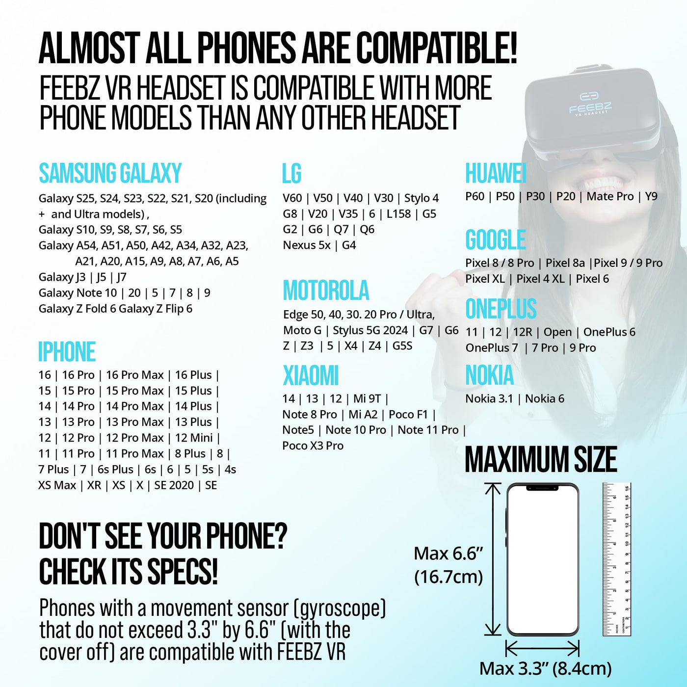 Q: Is the Feebz VR headset compatible with both iPhone and Android devices?A: Yes, the Feebz VR headset is designed to be compatible with a wide range of iPhone and Android models, making it suitable for users of both platforms.
