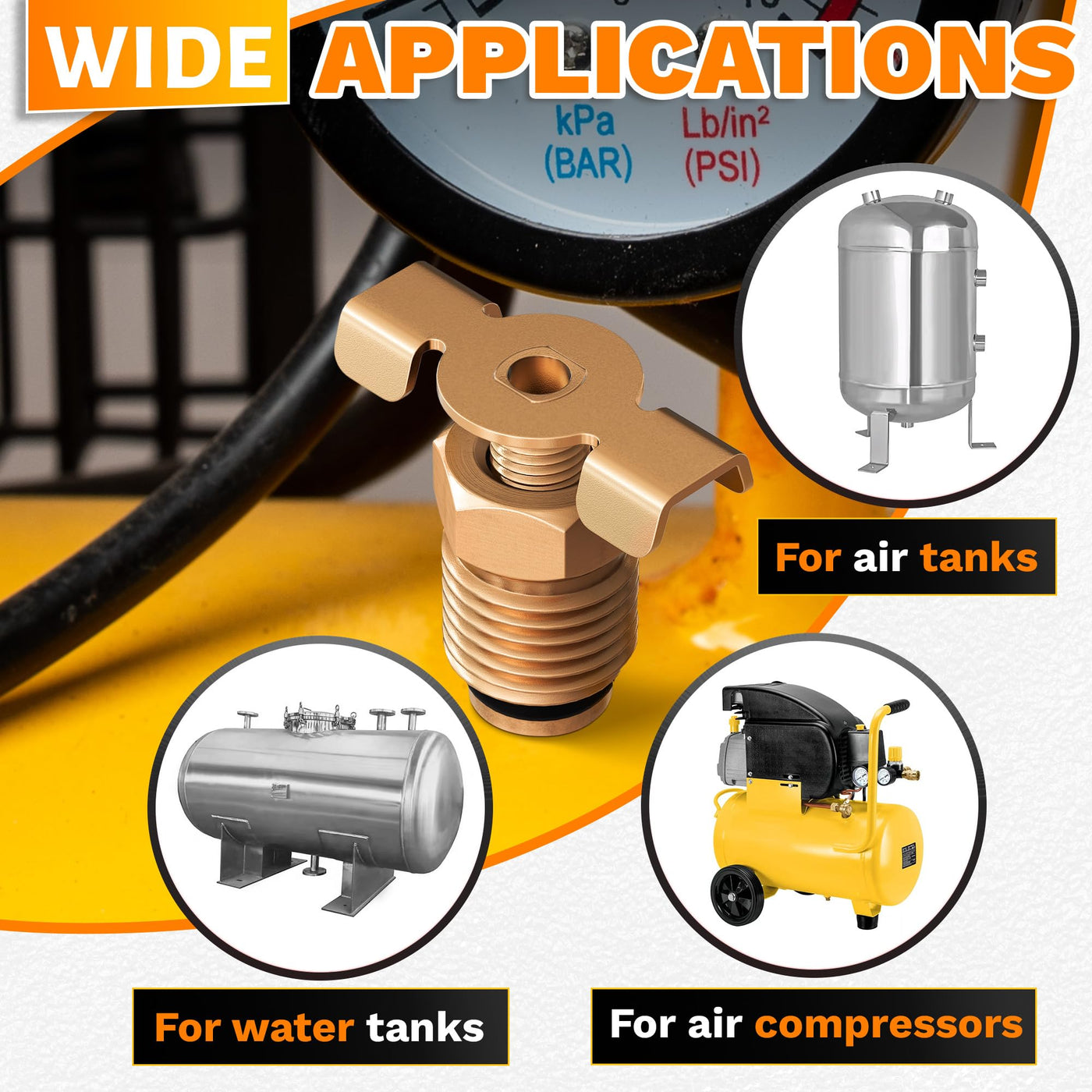 Air Compressor Tank Valve Portable Compressed Air Tank 1/4 Check Valve: This Craftsman Air Compressor Hose Valve Has Brass Material Which Will Last For A Long Time And Wont Rust Or Leak. Unlike Other Products That Use Iron, This Gas Compressor Water Shut Off Valve Has Inside Sealer Brass Material Which Has Much Better And Superior Working Experience. This Water Valve Shut Off Creates A Snug Fit To Prevent Unwanted Air Or Water Seepage In Your Air Compressor. This Air Compressor Attachments Drain Valve Can Be Used With Compressors Up To 150Psi. This Air Compressor Shut Off Valve Is Perfectly Solve The Problem Of Air Compressor Damage Or Leakage. This Air Compressor Craftsman Valve Is Rust-Proof, Not As Easily Corroded As Other Materials. This Compressed Air Portable Tank Valve Are High Temperature Resistance And Has Good Ductility And Low Magnetic Permeability. These Air Compressor Tools Have Unique Winged Style With Brass Handle That Can Be Twisted To Release And Tie Up Air Or Water. This Pressure Release Valve Is An Ideal Practical And Convenient Tool. Specification Material: Brass Size: 5.51 X 3.15 X 1.97 Inches Color: Golden Package Include: 1 X Air Compressor Water Drain Valve