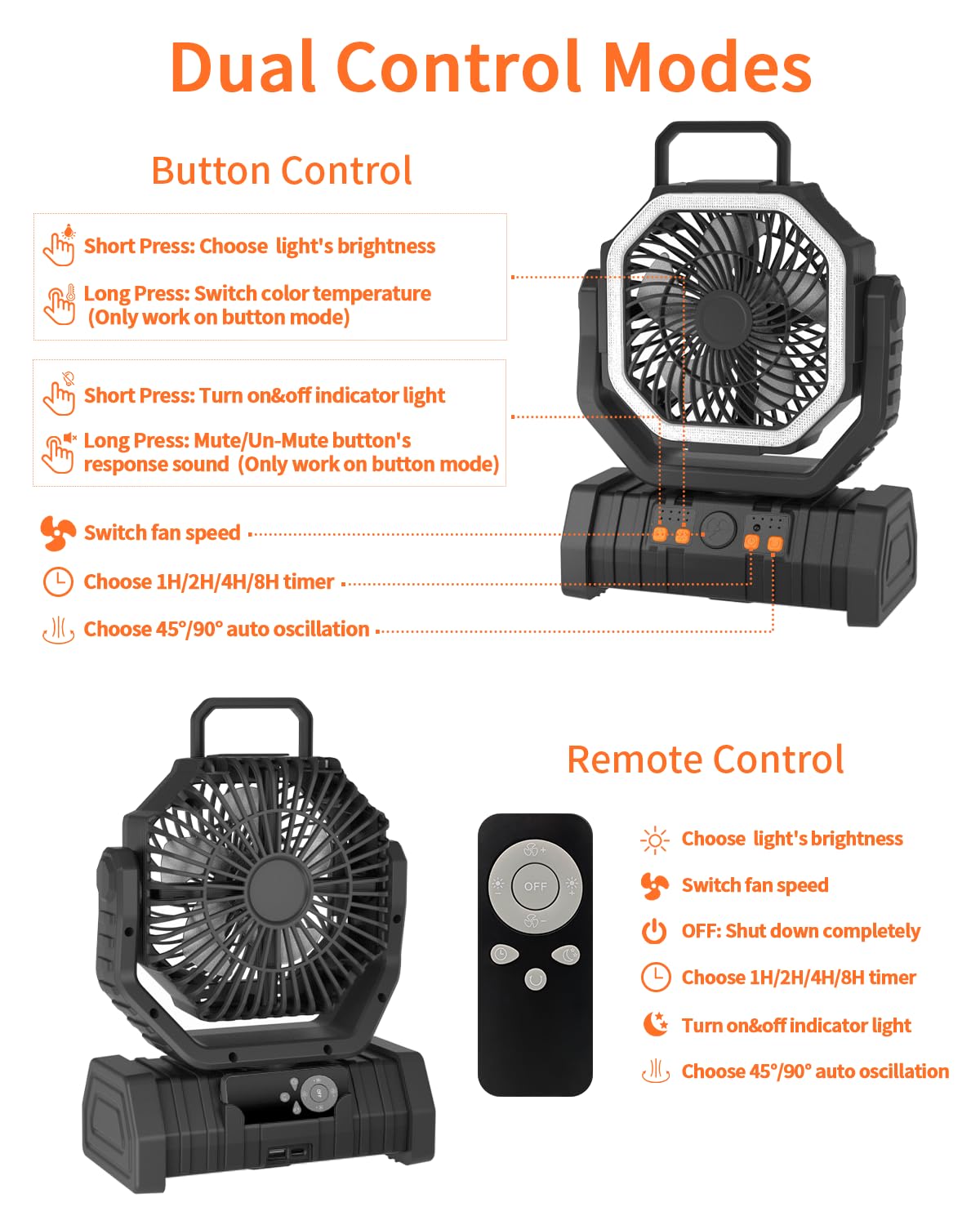 Adust Camping Fan Battery Powered Fan With Led Lantern Light 20000Mah Rechargeable Portable Fan, Oscillating Fan With 360 Rotation Hanging Hook For Tents, Usb Desk Fan For Bedroom, Office (Orange)