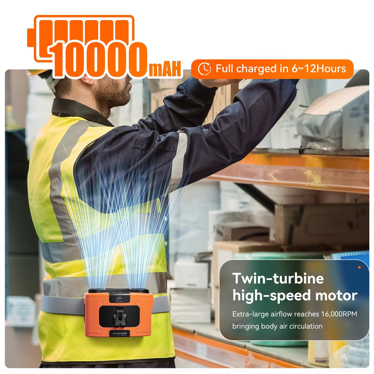 Q: What is the battery life of the Astaowl Waist Fan?A: The Astaowl Waist Fan features a powerful 10000mAh battery, providing 6 to 32 hours of usage depending on the speed setting you choose.