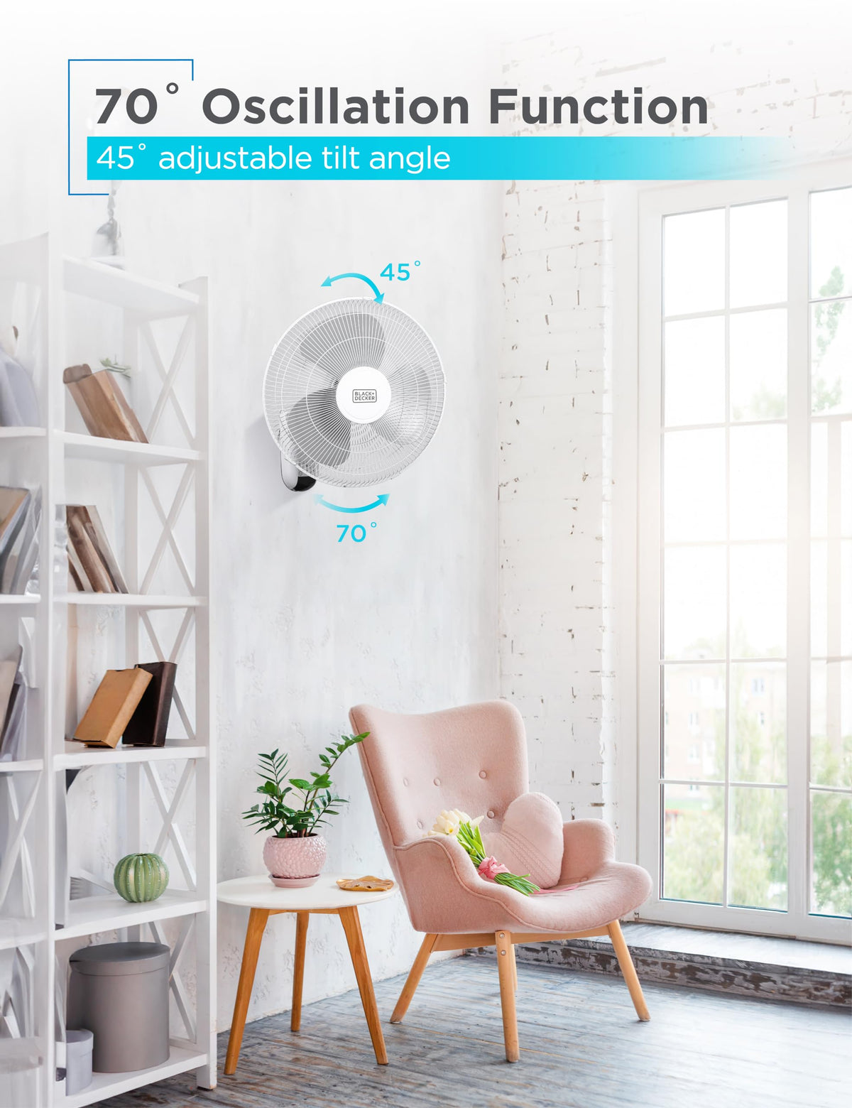 This Black+Decker Mounted Wall Fan Creates High Quality Breezy Circulation Any Time Of Day Or Night. Easily Install With An Included 3 Screws And Mounting Plate In Any Room In Your Home -- Whether It'S The Living Room, Bedroom, Kitchen, Basement Or Elsewhere. When It Comes To Top-Quality Fans For Bedroom, Ours Is Lightweight At 4.94 Lbs. With Unit Dimensions Of 17'' X 12'' X 18''. Who Doesn'T Love Remote Control Convenience? This Room Fan Includes A Fully Functional Fan Remote Control With Led Indicator Lights So You Can Program Your Settings And Turn On And Off At The Press Of A Button. This Cooling Fan Has 3 Speed Settings (Low, Medium & High) As Well As 3 Modes (Normal, Natural & Sleep). Our Wall Fan Also Includes A 70 Oscillation Function, 45 Adjustable Tilt Angle, 7.5-Hour Shut Off Wall Fan Timer And 70'' Long Power Cord. The Angle And Oscillating Versatility Make This Black+Decker Wall Mounted Fan Adaptable To Various Rooms While Reducing Cooling Costs. Kick Back And Enjoy The Breeze Any Time Or Day Or Night With Our 16'' Wall Mounted Electric Fan With Remote Control.
