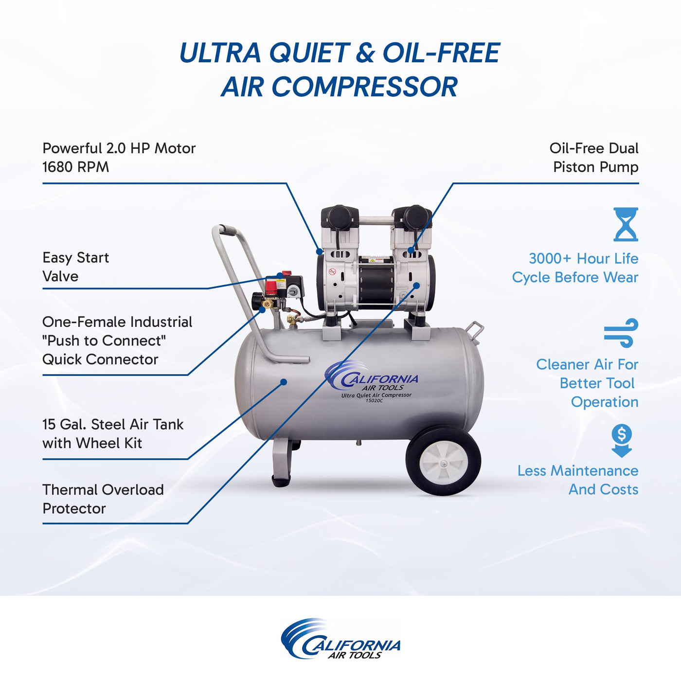 The California Air Tools 15020C Ultra Quiet & Oil-Free Air Compressor Is Designed To Be One Of The Quietest 2 0 Hip Air Compressors In The Industry Having Only 70 Decibels Of Sound The Powerful New 2 0 Hp (Sp-9421) Motor Operates At Only 1680 Rpm Creating Less Noise And Less Wear The New Sp Series Of Ultra Quiet Air Compressor Motors Have Been Designed To Increase Duty Cycle And Allow For Longer Continuous Run Times The Oil-Free Dual Piston Pump System Is Engineered For High Performance And Durability The Cat-15020C Air Compressors A Oil-Free Dual Piston Pump Designed To Have A Life Cycle Before Wear Of 3000 Plus Hours Compared To Other Comparable Air Compressors With Life Cycles Of 500 Hours Or Less The Oil-Free Pump Allows For Use In A Variety Of Temperatures (Cold Starts) And Uneven Terrains (No Oil In The Pump) Max Psi - 130 Psi The Easy Start Valve Feature Allows For A Easier Start Up Using Less Starting Amps The Easy Start Valve Releases A Small Amount Of Air From The Pump At Start Up To Produce A No-Load Condition Allowing The Motor To Spin Freely This No-Load Start Up Requires Less Amps For A Easier Start Up In Cold Temperatures The Large 15 Gallon Steel Air Tank With Wheel Kit Makes It Very Easy To Move Around The Jobsite, Shop Or Garage Designed For The Person Looking For Power, Air Flow, Less Service And Maintenance With At Least 30% Less Noise
