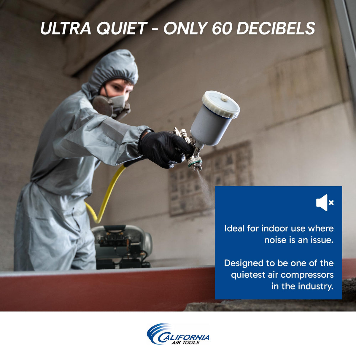 Q: What makes the California Air Tools CAT-4610AC air compressor ultra quiet?A: The California Air Tools CAT-4610AC operates at only 60 decibels, which is significantly quieter than many conventional air compressors. This low noise level is achieved through its robust 1.0 HP motor that runs at a low RPM of 1680, making it ideal for noise-sensitive environments.