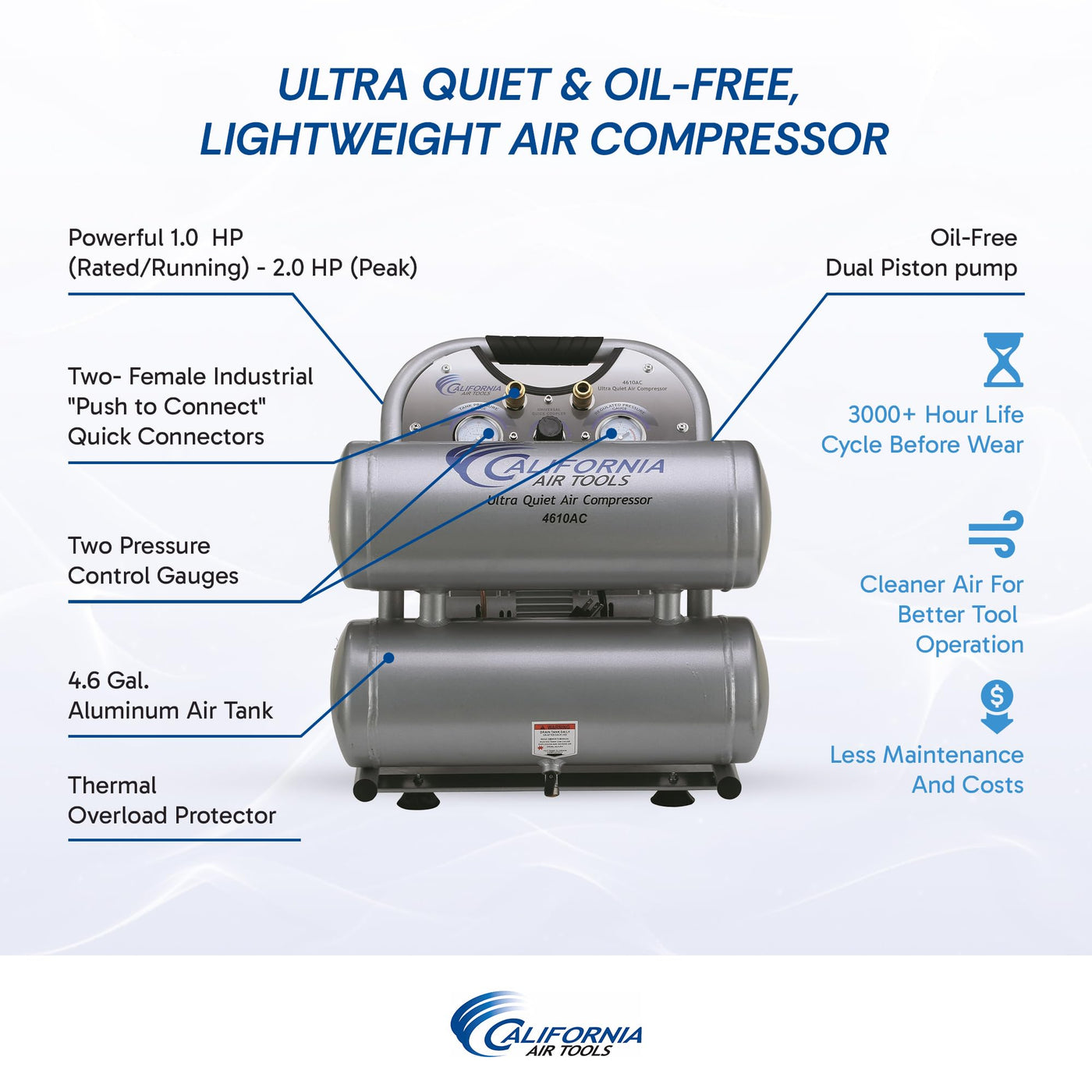California Air Tools Cat 4610Ac Ultra Quiet & Oil Free 1.0 Hp 4.6 Gallon Aluminum Twin Tank Electric Portable Air Compressor, Si