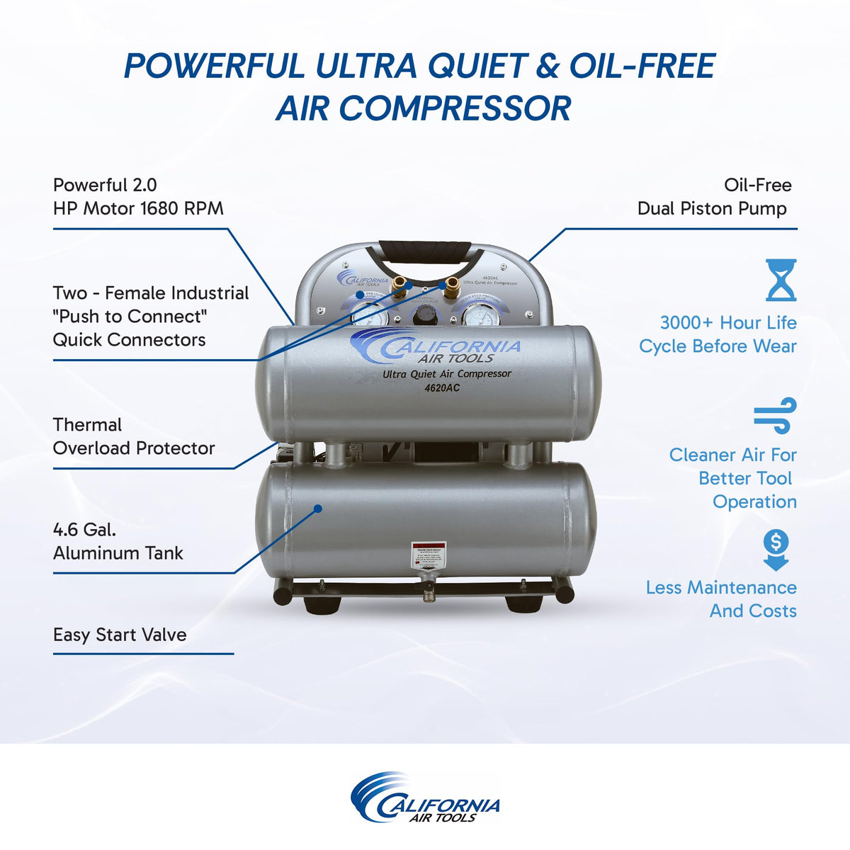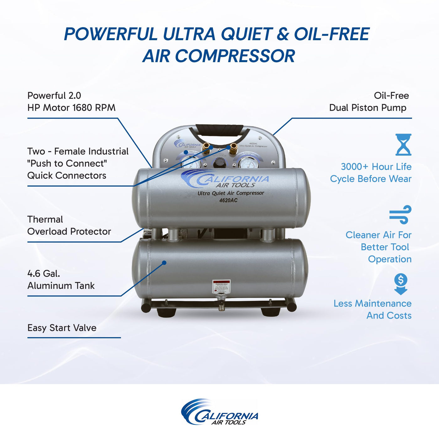 The California Air Tools 4620Ac Ultra Quiet & Oil-Free Air Compressor Is Designed To Be One Of The Quietest 20 Hp Air Compressors In The Industry Having Only 70 Decibels Of Sound The Powerful New 20 Hp (Sp-9421) Motor Operates At Only 1680 Rpm Creating Less Noise And Less Wear The New Sp Series Of Ultra Quiet Air Compressor Motors Have Been Designed To Increase Duty Cycle And Allow For Longer Continuous Run Times The Oil-Free Dual Piston Pump System Is Engineered For High Performance And Durability The Cat-4620Ac Air Compressor Has A Oil-Free Dual Piston Pump Designed To Have A Life Cycle Before Wear Of 3000 Plus Hours Compared To Other Comparable Air Compressors With Life Cycles Of 500 Hours Or Less The Oil-Free Pump Allows For Use In A Variety Of Temperatures (Cold Starts) And Uneven Terrains (No Oil In The Pump) The Easy Start Valve Feature Allows For A Easier Start Up Using Less Starting Amps The Easy Start Valve Releases A Small Amount Of Air From The Pump At Start Up To Produce A No-Load Condition Allowing The Motor To Spin Freely This No-Load Start Up Requires Less Amps For An Easier Start Up In Cold Temperatures The Large 46 Gallon Aluminum Air Tank Is Only 672 Pounds Making It Very Easy To Move Around The Jobsite Designed For The Person Looking For Power, Air Flow, Less Service And Maintenance With At Least 30% Less Noiselow Amp Draw - 14 Amps