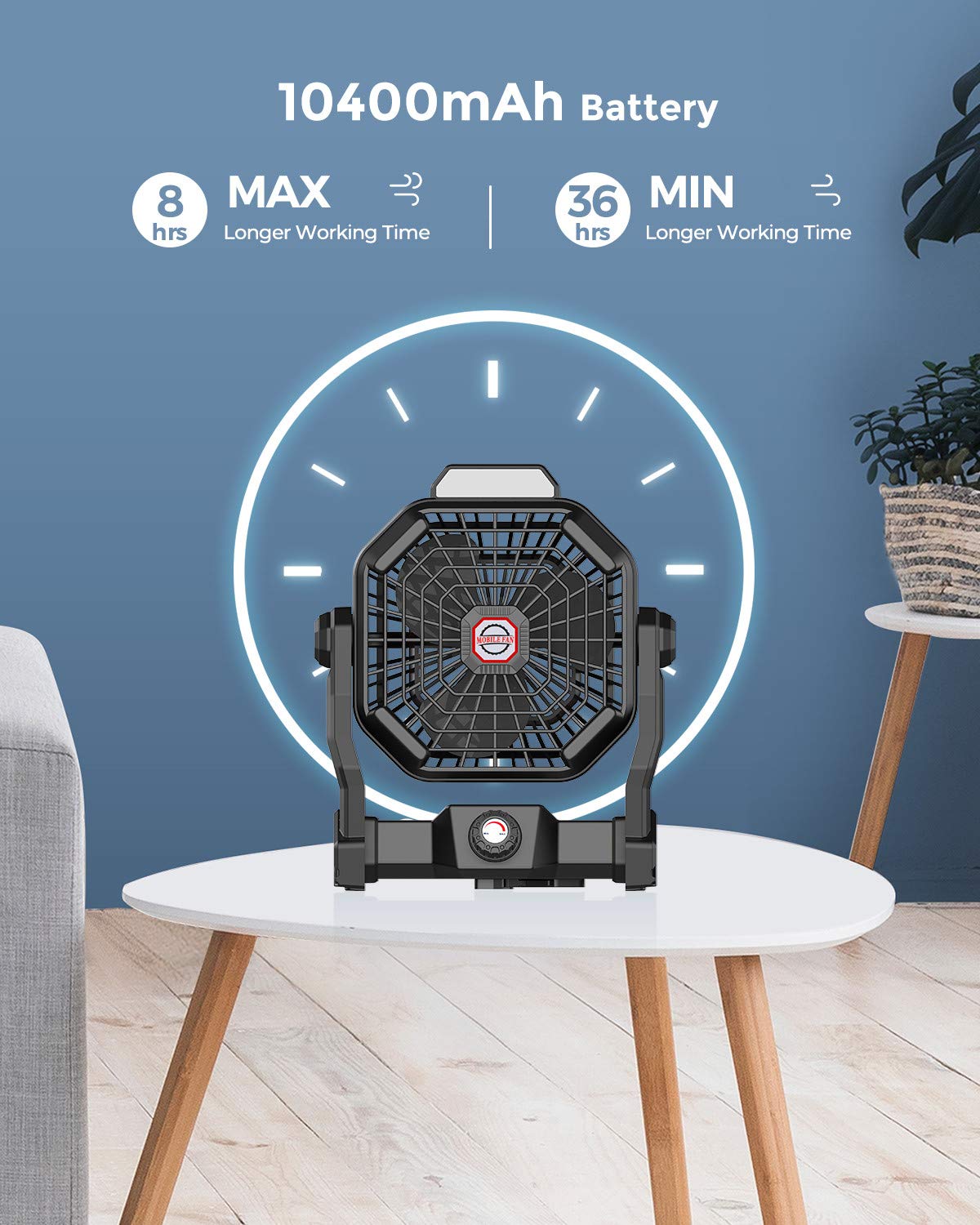Camping Fan With Led Lantern, 10400 Mah 9 Inch Rechargeable Battery Powered Fan With 270Head Rotation, Stepless Speed And Quiet