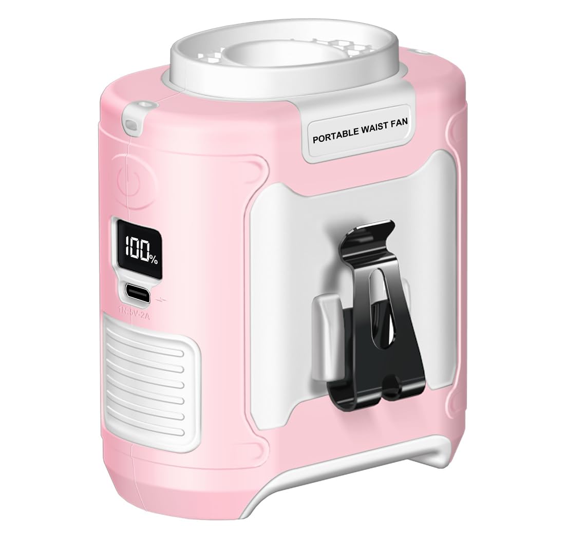 Q: What materials are used in the construction of this waist clip fan?A: The fan is made from durable PC material and features a manganese steel clamp, which is more resilient than typical plastic clamps, enhancing both longevity and grip.