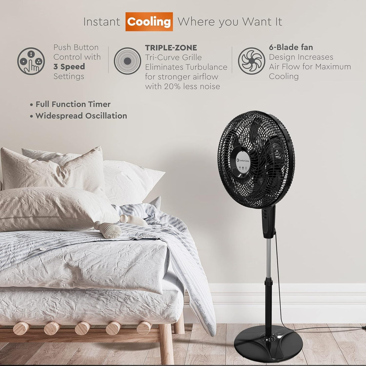 Comfort Zone Powrcurve Oscillating Pedestal Stand Fan, 18 Inch, 6 Blades, Tri-Curve Grill For Reduced Noise, 180 Adjustable Tilt