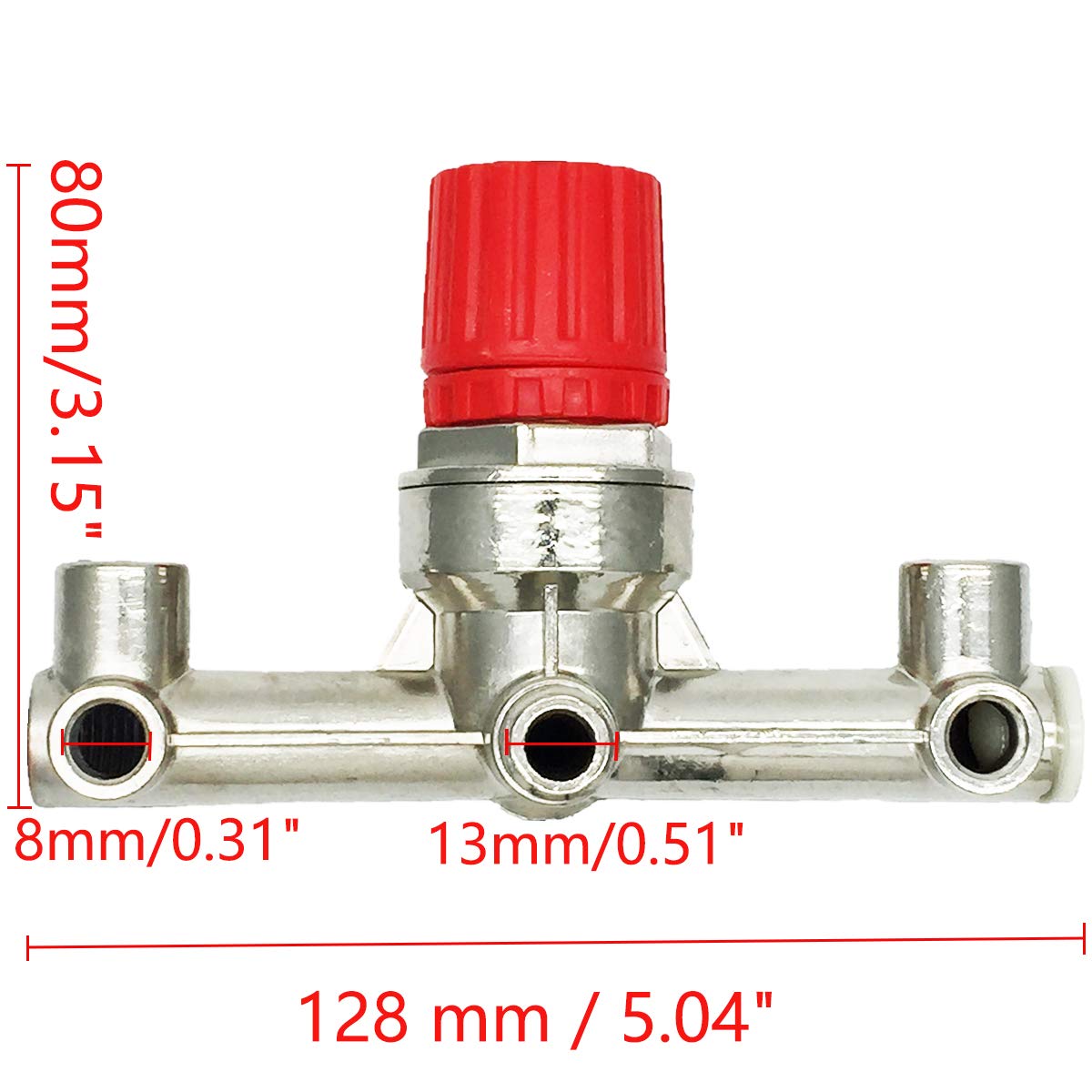Product Name: Air Pressure Regulator Valve Material:Alloy Steel Size:128 X 82 X 80Mm/5.04'' X 3.23'' X 3.15'' Zinc Alloy Male Thread Dia.:Big:21Mm--1/2'' Pt; Small:13Mm--1/4''Pt Zinc Alloy Female Thread Dia.:8Mm--1/8''Pt Copper Male Thread Dia.:13Mm--1/4''Pt Main Color:Silver Tone,Red Weight:152G Package Content: 1X Air Pressure Regulator Valve