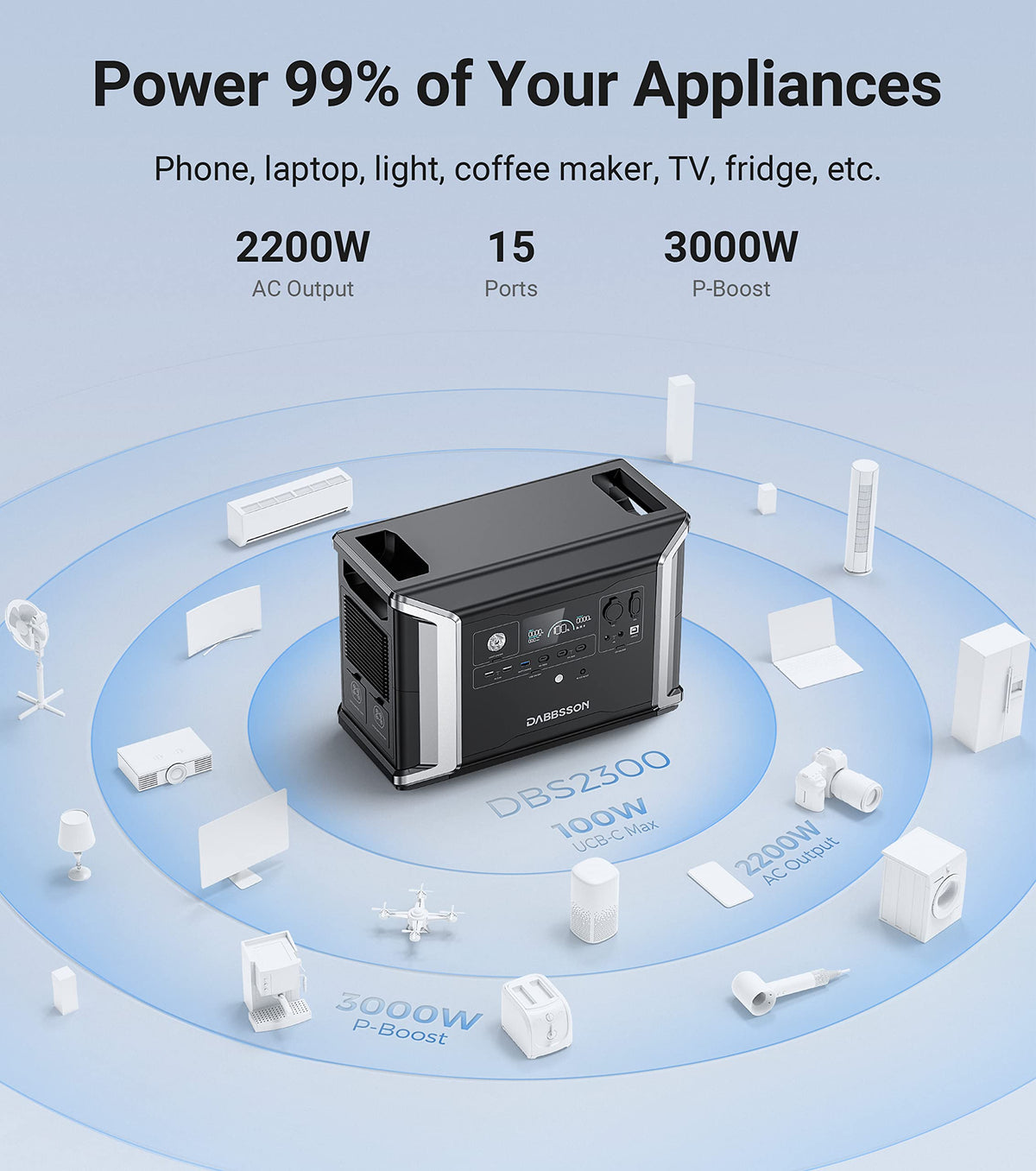 [???????????????? ???????? ???????????? & ???????????????? ??????????]: With Built-In 5 X 2200W (3000W With P-Boost On), Pure Sine Wave Ac Outlets, And Up To 3 Usb C Charging Port 100W Max, You Get Stable Power For Your Phone, Laptop, Fridge, And 99% Of Home Devices, Ideal For Travel And Home Backup. | [?????????? ???? ???????????????? ????????????]:Dabbsson Is The First Brand To Use Industry-Leading Ev Semi-Solid State Lifepo4 Batteries And The Highest Fireproof Rating Ul94 V0 Outer Shell The Thermal Runaway Is 4X Higher Than Li-Nmc Battery Which Is More Stale In Hotter Temperature, The Ideal Choice For Safe Storage Ever. Use And Recharge Dbs2300 More Than 4500 Times (Extra 500 With Bms System) Before Hitting 80%, Almost 15 Years Of Regular Use. | [???????????????????? ?????????? ????????????????]: Easily Expand The 2330Wh Capacity Battery Power Station. Link Two Extra Batteries To Get A Massive 8330Wh, Keeping Your Home Powered On In Any Emergency And Satisfying Your Electricity Needs For Days During Power Outages Or A Blackout. | [4 ???????? ???????? ???? ????????????????]: The Ac Input Features 1800W Max, Recharging Your Dbs2300 To 98% In Just 1.5 Hours And You Can Adjustable 200-1800W By Our App As You Need. The Solar Input Supports 3000W Max Endless Green Power That Can Fully Charge Dbs2300+2Dbs3000B In Only 2.5 Hours. You Can Also Use A 12V/24V Car Charger On-The-Go Or A Generator Charger (Extra Adapter Needed). | [15???? ?????? ????????-????????????]:With A Switchover Speed Of Less Than 15Ms, You Won'T Even Notice Your Power Is Low. Use The Dbs2300 As An Emergency Power Supply For Overnight Outages To Keep Your Appliances Running. | [???????? ?????? ??????]: Dabbsson Dbs2300 Portable Power Station, 1X1800W Ac Charging Cable, 1Xsolar Charging Cable, 1Xcar Charging Cable, 3+2 Years Warranty, And Friendly Local Customer Service.